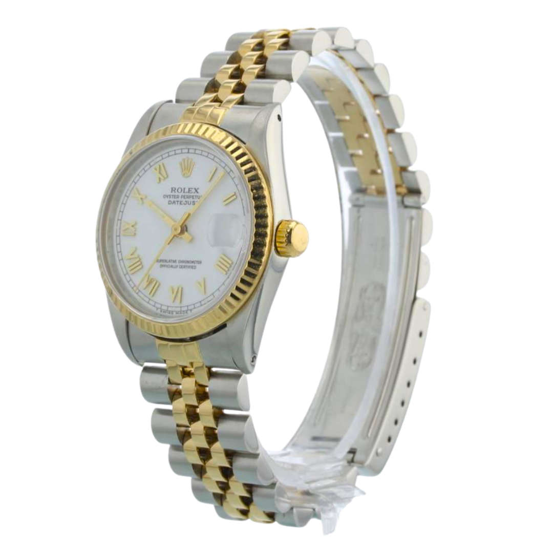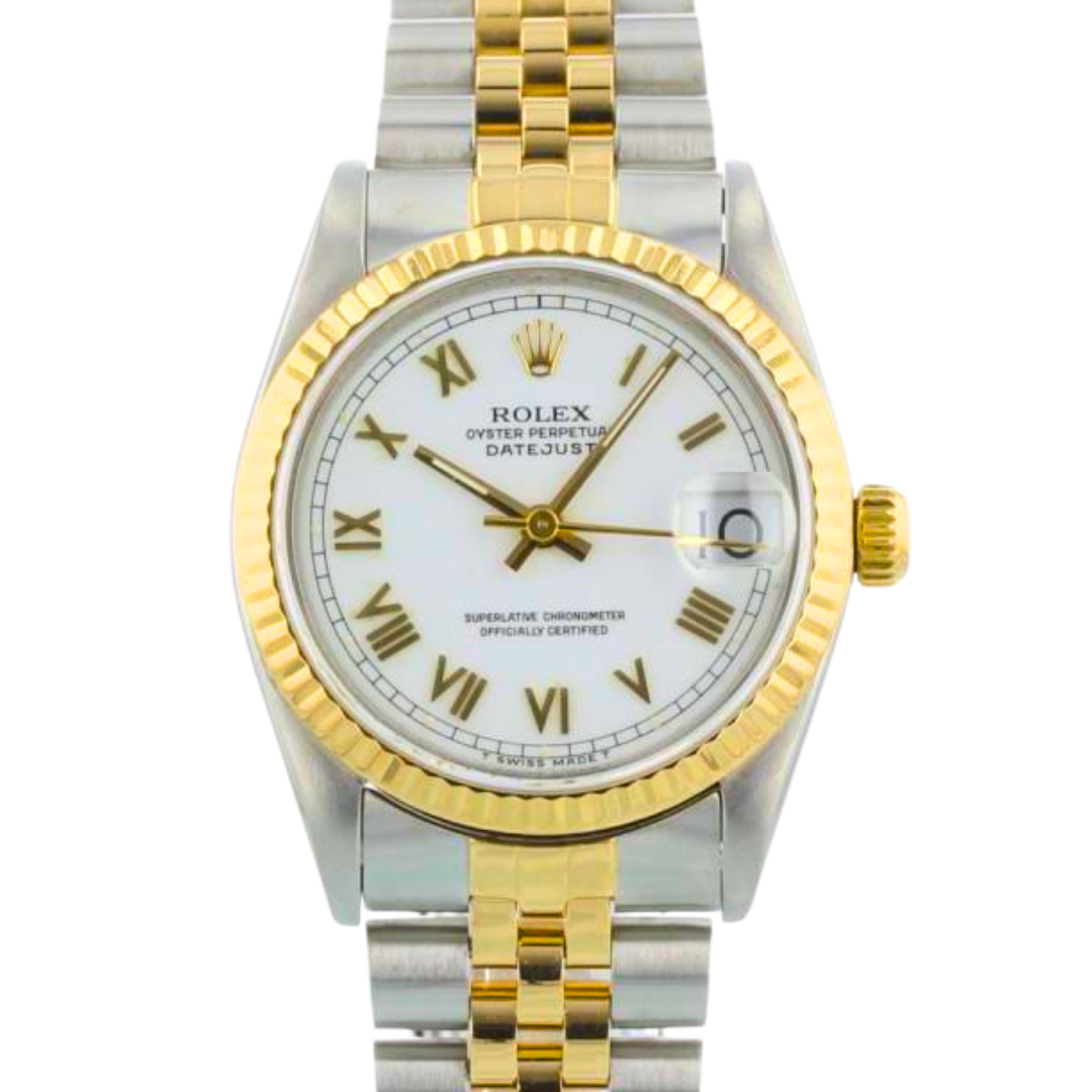 The white Roman numeral dial provides strong visual contrast, with applied gold Roman markers offering depth and legibility, while the Cyclops lens magnifies the date display at 3 o’clock. Powering the watch is the Rolex calibre 2135 automatic movement, a robust and reliable chronometer explicitly designed for the 31mm Datejust platform, offering excellent accuracy and everyday usability.