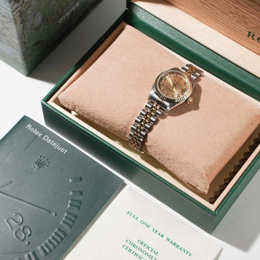 A Rolex Datejust reference 69173 in bi-metal stainless steel and 18ct yellow gold, featuring a classic champagne dial set with original Rolex diamond hour markers. The dial’s warm tone is complemented by the 18ct yellow gold fluted bezel and matching centre links on the Jubilee bracelet, delivering a timeless, elegant aesthetic that has remained a staple of the Datejust collection.