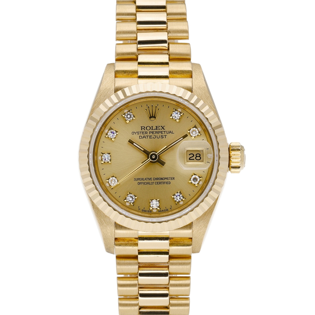 A Rolex Datejust reference 69178 in full 18ct yellow gold, featuring a classic champagne dial set with original Rolex diamond hour markers. The rich gold tones are perfectly matched to the fluted 18ct yellow gold bezel and President bracelet, delivering a timeless, luxurious aesthetic that defines the traditional Datejust design.
