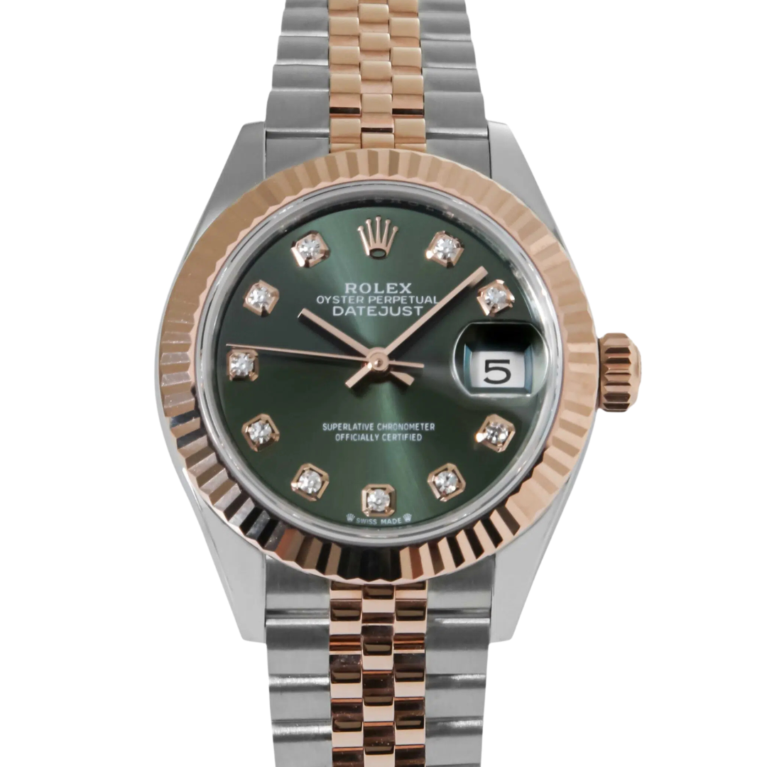 The Rolex Datejust reference 279171 is a refined and highly sought-after modern interpretation of one of Rolex’s most enduring designs. Crafted in stainless steel and 18ct Everose gold, this 28mm model features the signature fluted bezel in solid rose gold, complemented by a rich green dial set with diamond hour markers, delivering both elegance and strong visual presence.