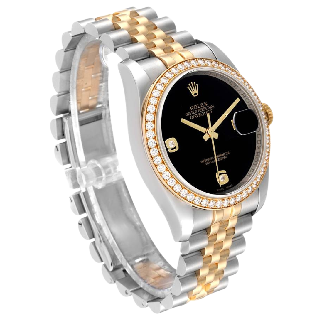 A Bi-Metal Rolex Datejust Watch, Stainless Steel and 18ct Yellow Gold with an Original Diamond Bezel and Diamond 6 + 9 Numerals on a Black Dial.