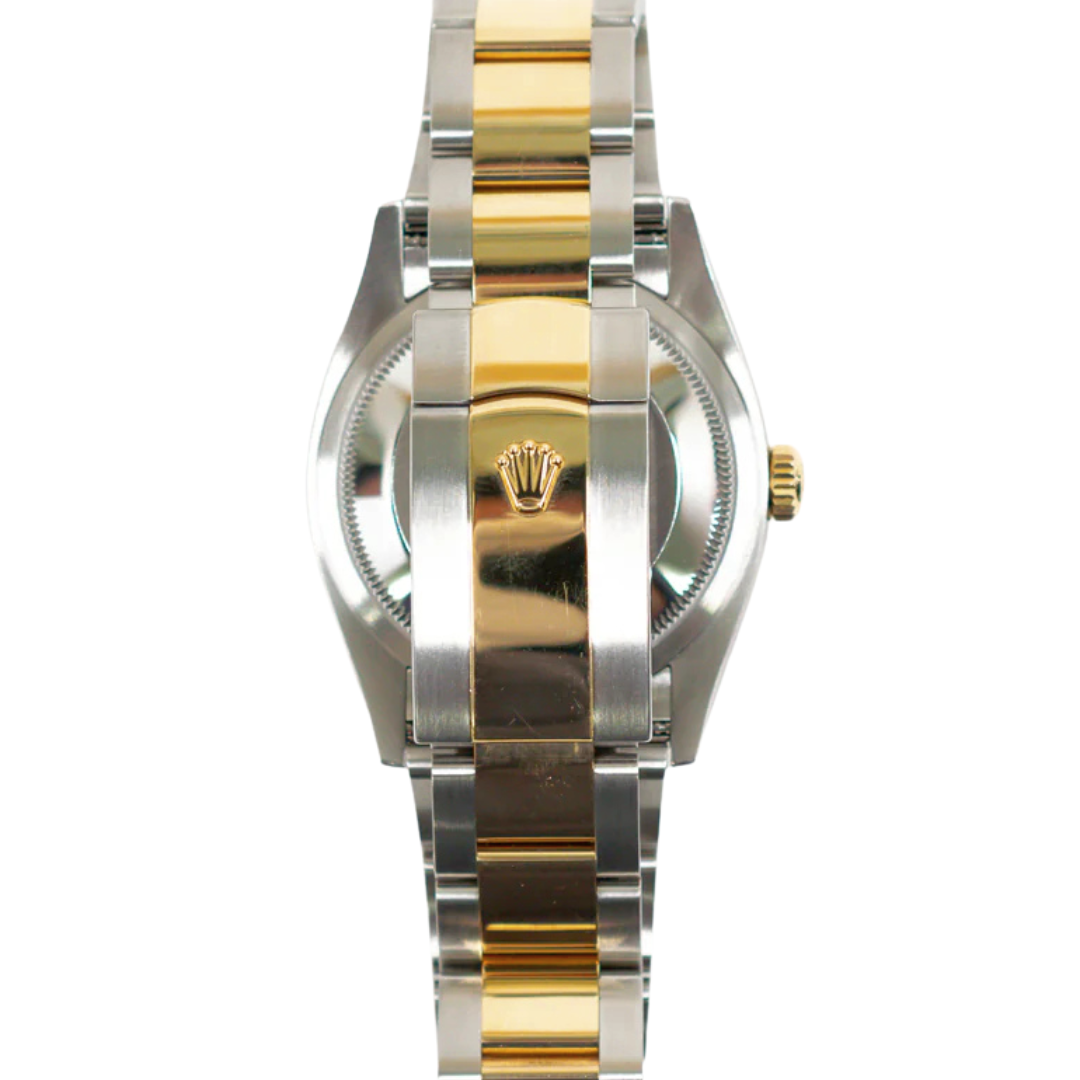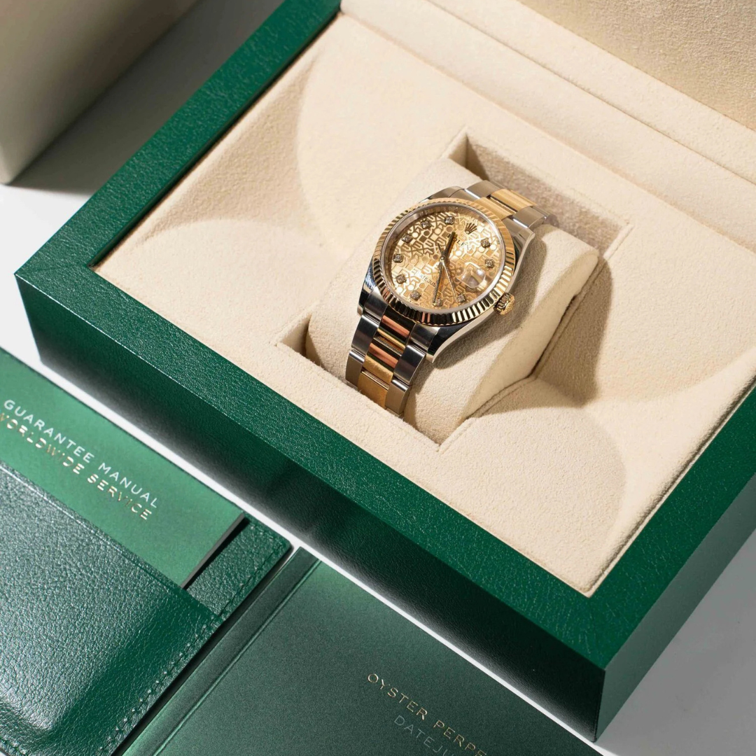 A Rolex Datejust 126233 in stainless steel and 18ct yellow gold, featuring the striking champagne Jubilee dial adorned with the iconic repeating Rolex motif. This highly distinctive dial is complemented by original factory diamond hour markers, adding a refined brilliance that enhances its visual depth without compromising the classic Datejust aesthetic. The 36mm Oyster case is paired with a fluted yellow gold bezel, creating a timeless and recognisable profile that has defined the model for decades.