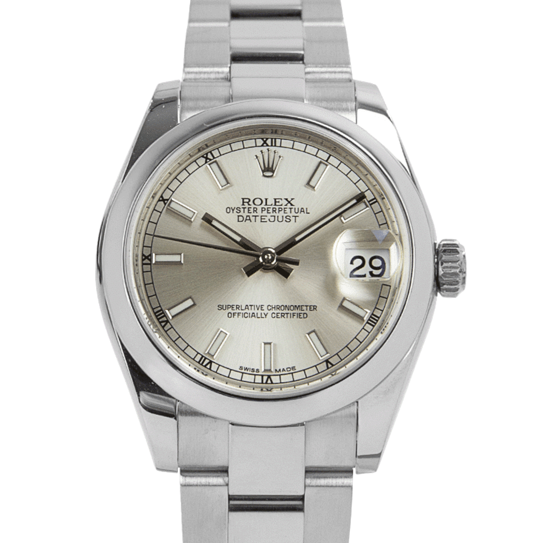 A Rolex Datejust reference 178240 in stainless steel, featuring a smooth bezel and a silver dial with applied baton hour markers and a subtle inner minute track. The 31mm case offers a balanced and versatile profile, making it an ideal option for those seeking a refined everyday watch with classic Rolex proportions.