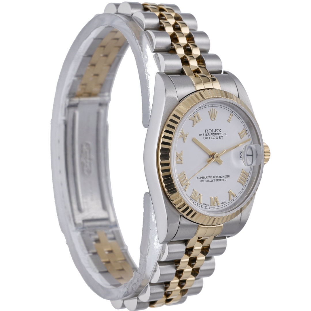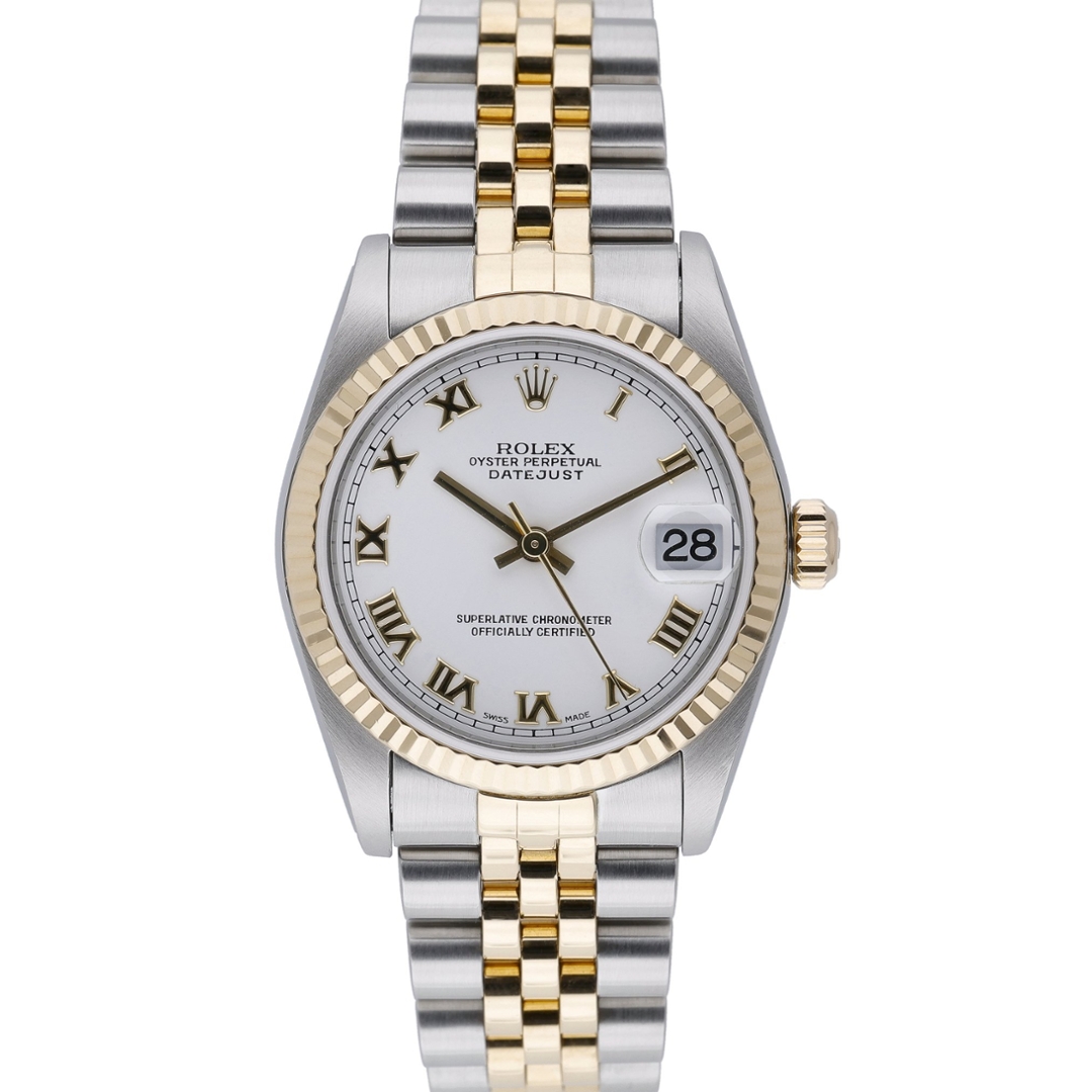 A bi-metal Rolex Datejust watch crafted from stainless steel and 18ct yellow gold, featuring a crisp white dial that highlights the elegance of this classic mid-size model. Model number 78273, this 2000 example is powered by the reliable Rolex Calibre 2235 automatic movement—renowned for its precision, durability, and smooth performance. The 31mm case offers a perfect blend of refinement and versatility, making it ideal for those who prefer a sophisticated yet understated timepiece.