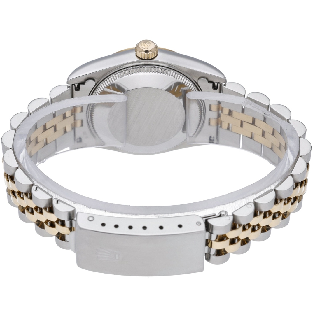 The white dial is beautifully balanced, featuring applied gold baton hour markers and a signature Cyclops lens that magnifies the date display at 3 o’clock. The 18ct yellow gold fluted bezel and matching gold centre links of the Jubilee bracelet add warmth and luxury to the overall aesthetic, creating a timeless two-tone combination that remains as desirable today as when it was first introduced.