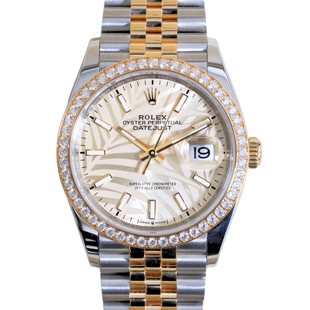 A bi-metal Rolex Datejust watch crafted from stainless steel and 18ct yellow gold, featuring a factory-set Rolex diamond bezel and an exquisite original champagne palm dial. Model number 126283RBR, this 2023 example is powered by the Rolex Calibre 3235 automatic movement, celebrated for its precision, 70-hour power reserve, and chronometer-certified performance. The 36mm case pairs perfectly with the elegant Jubilee bracelet, combining refinement, comfort, and unmistakable Rolex craftsmanship.