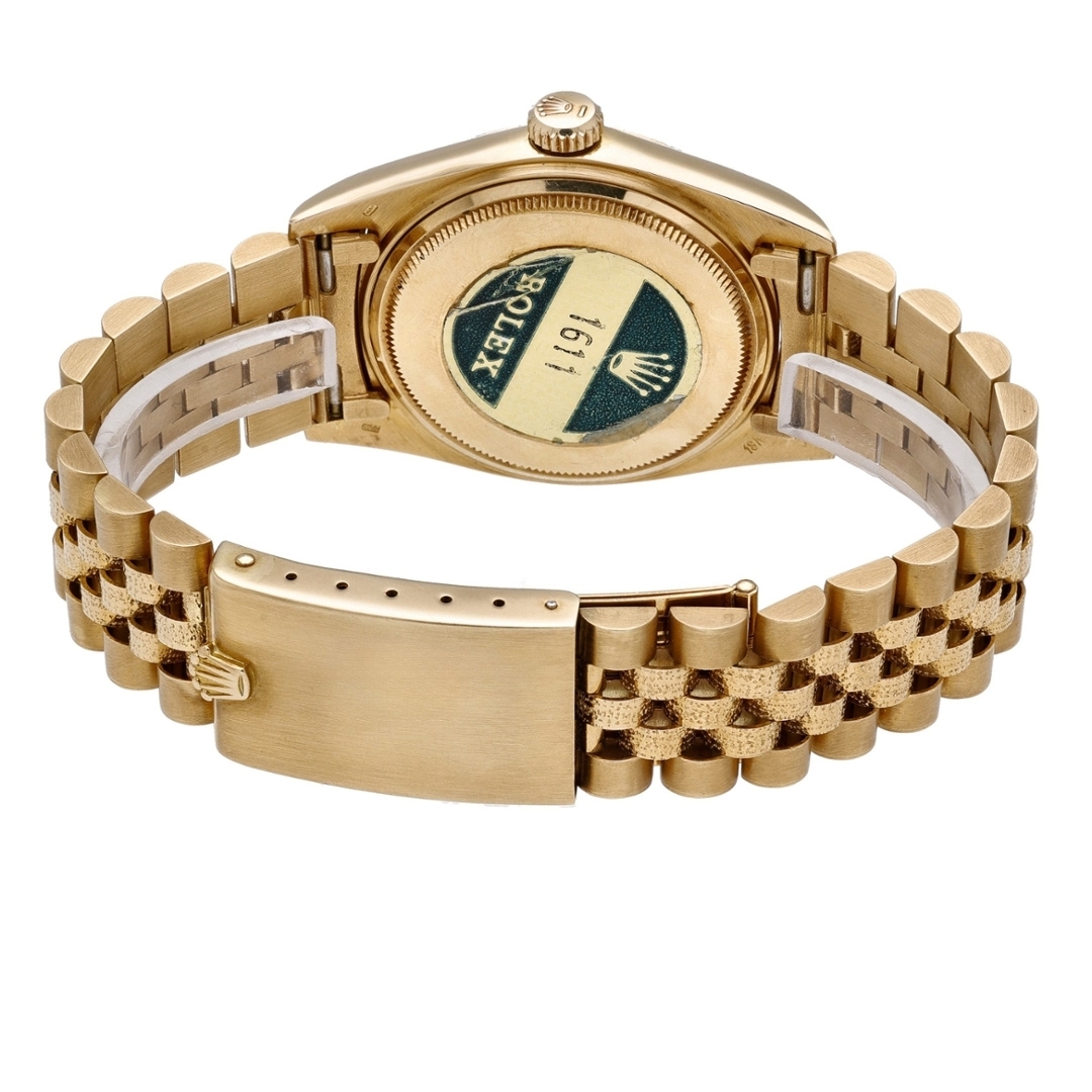 A Rolex Datejust Watch, full 18ct yellow gold, featuring the rare and eye-catching Morellis finish on both its bezel and Jubilee bracelet centre links. This distinctive textured detail sets this vintage piece apart from standard gold variants. This model, reference 1611, features a deep black dial accented with gold baton hour markers and matching hands, resulting in a timeless and elegant aesthetic.