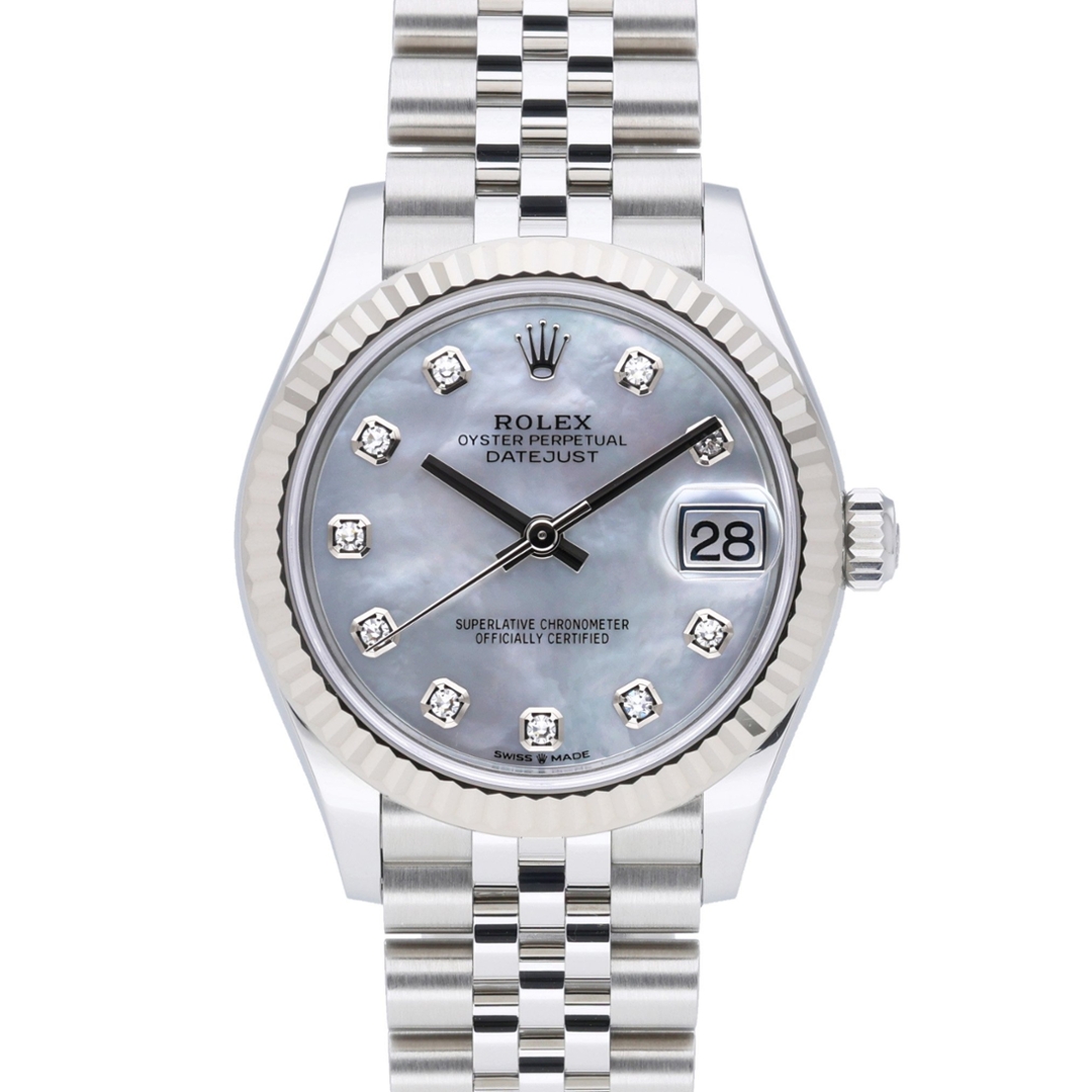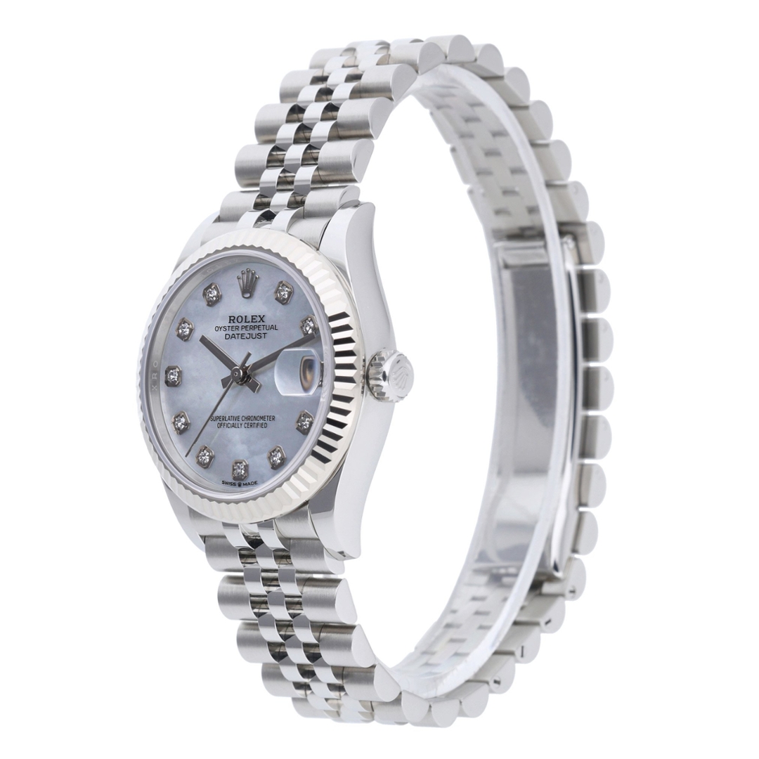 A Rolex Datejust Watch, reference 278274, elegantly combines timeless craftsmanship with refined luxury. Crafted from stainless steel and featuring an 18ct white gold fluted bezel, this 2021 model presents a sublime Mother-of-Pearl dial set with original Rolex factory diamond hour markers — each one expertly positioned to enhance the opulent iridescence of the dial.