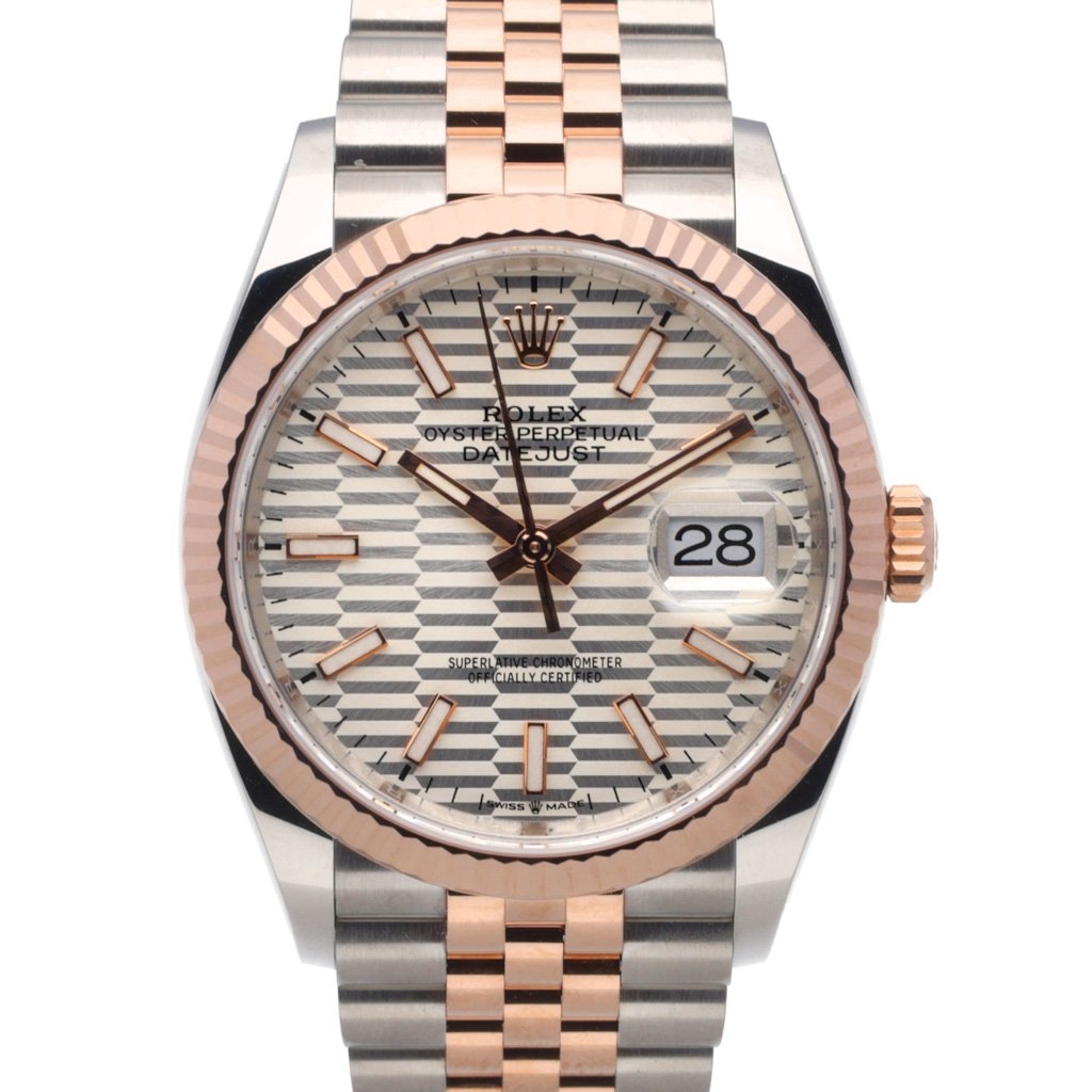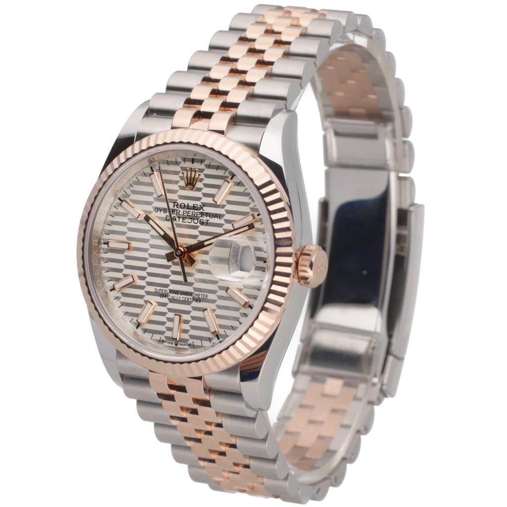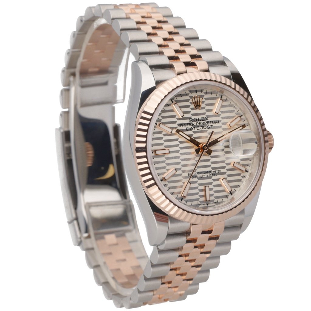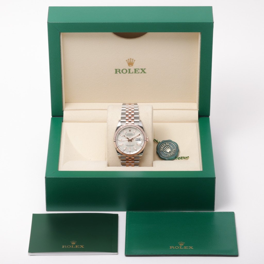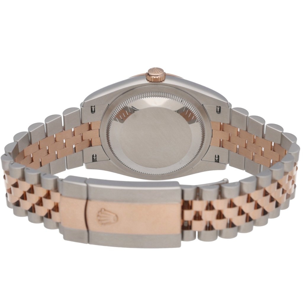 This 2022 Rolex Datejust 126231 perfectly balances elegance and modern craftsmanship. Constructed from a harmonious blend of Oystersteel and 18ct Everose gold, the 36mm case is complemented by Rolex’s signature fluted bezel — crafted from solid Everose gold, adding both distinction and timeless sophistication.
