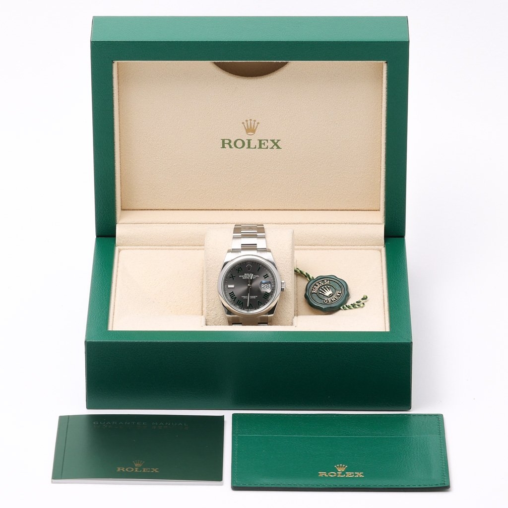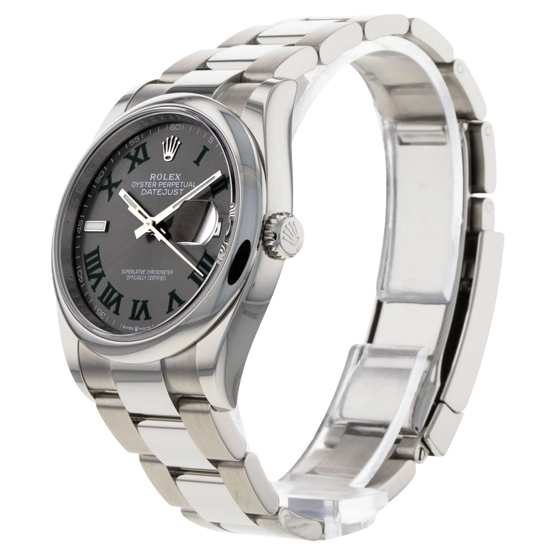A Rolex Datejust 126200, a sleek and modern iteration of the classic Datejust design, is a stunning timepiece that combines precision, style, and versatility. This 2024 model is crafted from stainless steel, offering robustness and a refined aesthetic. The 36mm case provides a more significant wrist presence while maintaining a timeless, elegant profile. The slate dial is striking, offering a dark, sophisticated hue that contrasts beautifully with the polished silver hour markers and hands. This contemporary colour choice gives the watch a unique, understated look that is versatile for any occasion.
