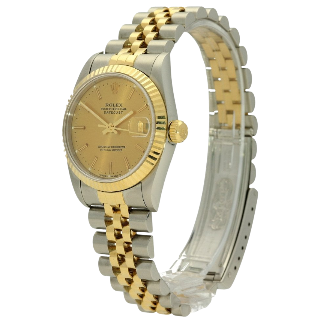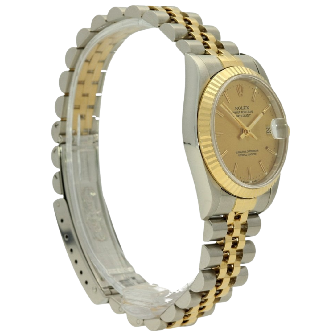 A bi-metal Rolex Datejust 31 offering timeless refinement, this reference 68273 pairs stainless steel with 18ct yellow gold for a classic two-tone finish. The champagne dial complements the fluted yellow-gold bezel perfectly, creating that unmistakable Datejust warmth collectors love. The clean baton hour markers and matching gold hands give this 1995 example an elegant, understated presence, while the 31mm case size makes it a versatile choice for both daily wear and more formal occasions.