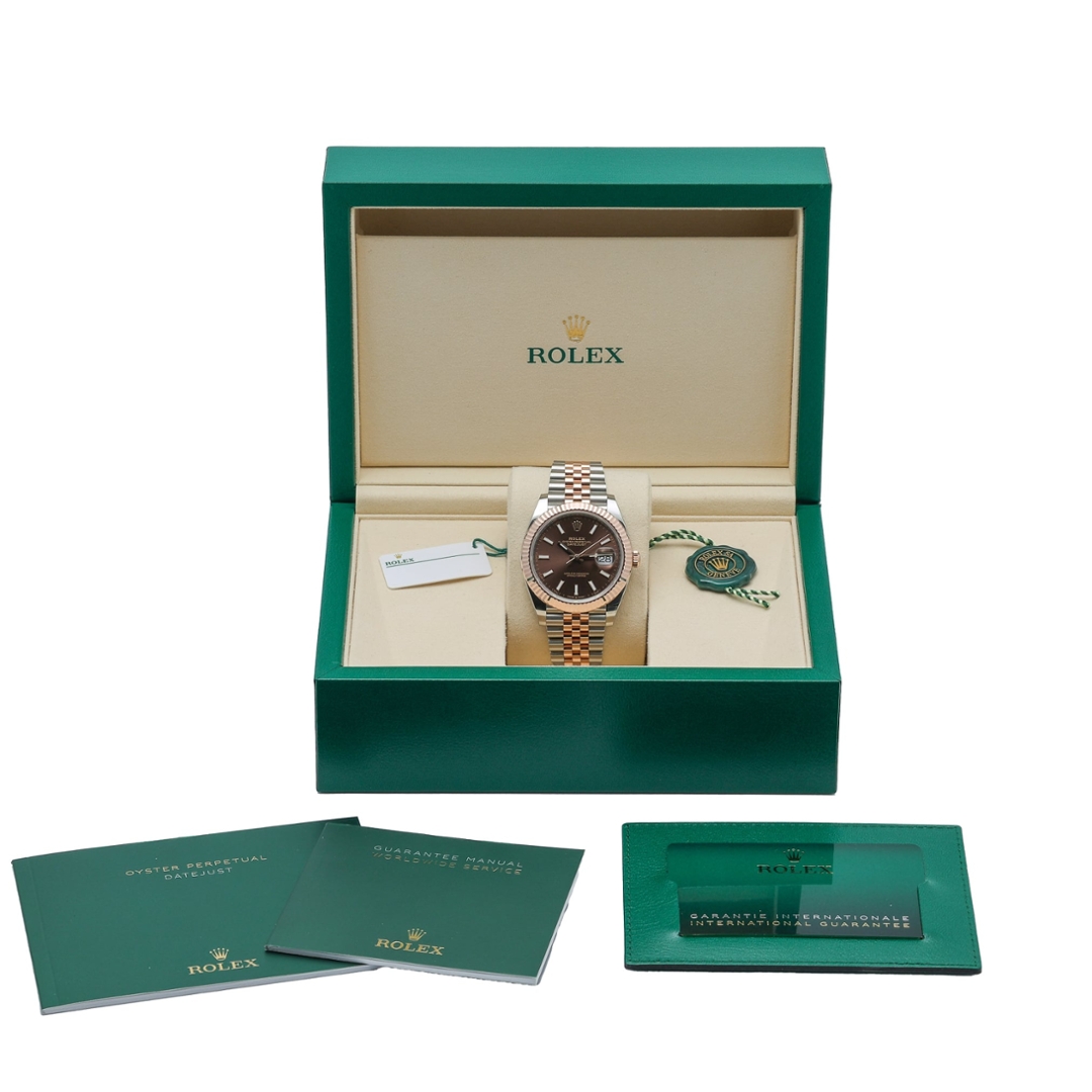 A Rolex Datejust 126331 combines luxury and timeless design, seamlessly blending stainless steel and 18ct rose gold for an elegant yet robust look. This 2025 model features a stunning chocolate dial, offering a sophisticated and versatile aesthetic. The 41mm case size provides a contemporary yet comfortable fit, making it suitable for formal occasions and everyday wear. The rose gold bezel adds a touch of warmth and elegance, perfectly complementing the dial.
