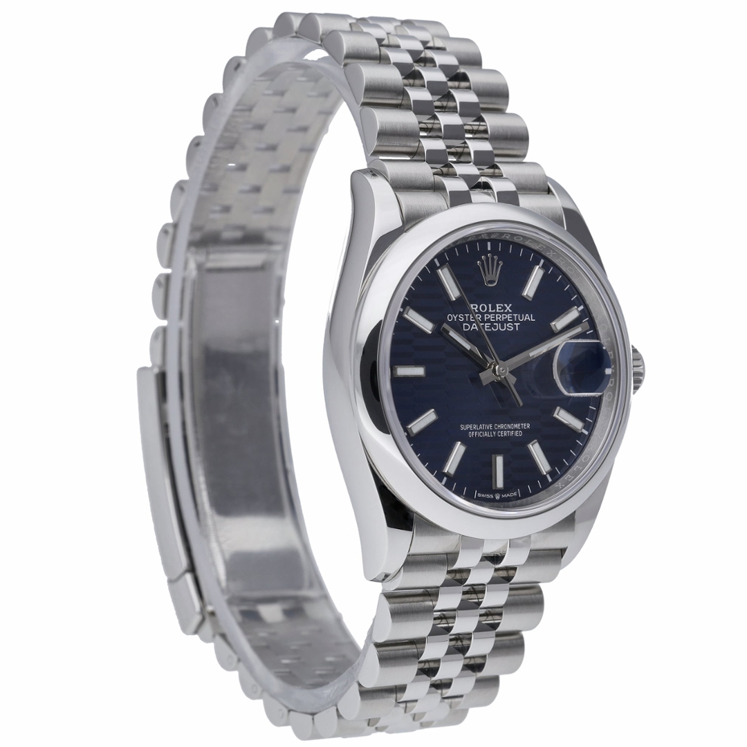 A Rolex Datejust 126200, this 36mm stainless-steel model features the highly desirable blue fluted-motif dial — one of Rolex’s most sought-after modern dial designs. The pattern adds depth and visual character while maintaining the classic Datejust aesthetics that continue to perform exceptionally well in the market.