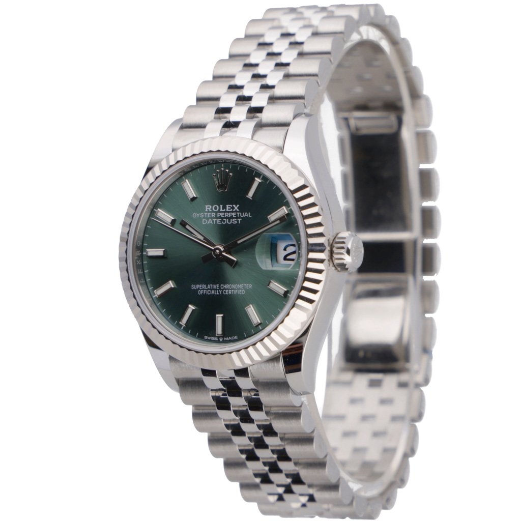This 2022 Rolex Datejust 31 (ref. 278274) is a perfect fusion of elegance, modernity, and Rolex precision. The vibrant green dial — one of the most sought-after shades in the current collection — adds a fresh, contemporary energy to the classic Datejust design. Its sunray finish catches the light beautifully, contrasting against the crisp white gold fluted bezel for a truly distinctive appearance.