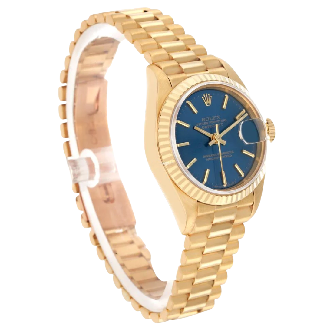 A Rolex Datejust Watch, Full 18ct Yellow Gold with a Fluted Bezel on a Blue Dial