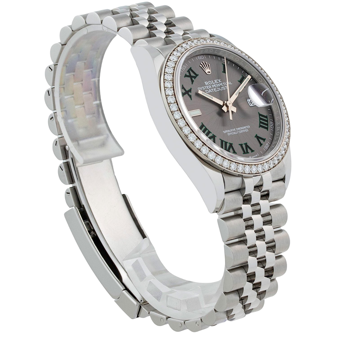 A 2022 example of the Rolex Datejust 36, this reference 126284RBR pairs refined craftsmanship with a striking, contemporary aesthetic. The 36mm stainless-steel case is complemented by an 18ct white-gold diamond-set bezel, offering a sophisticated sparkle that elevates the watch without compromising its versatility. The slate dial is one of the standout configurations in the modern Datejust line, featuring rich tones and contrasting green Roman numerals that give the watch a distinctive and highly desirable look. Paired with the Jubilee bracelet, it delivers exceptional comfort and unmistakable Rolex elegance.