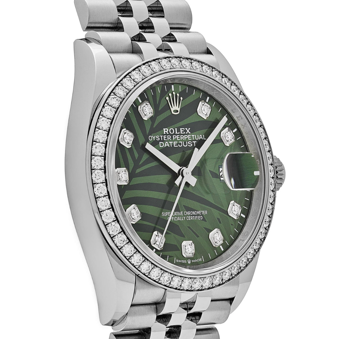 A Rolex Datejust Watch, Stainless Steel with an 18ct White Gold Diamond Bezel and a Green Palm Dial.