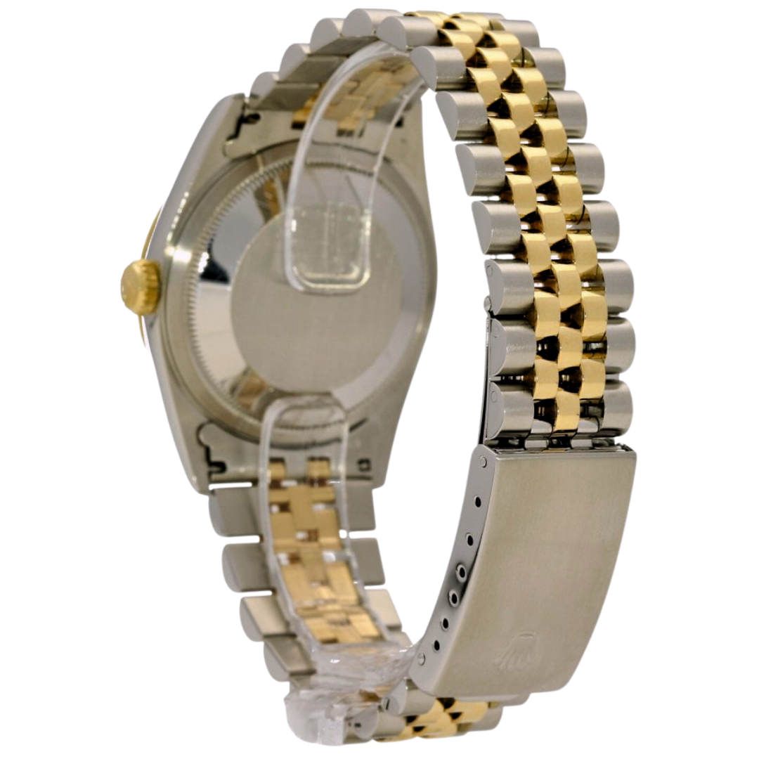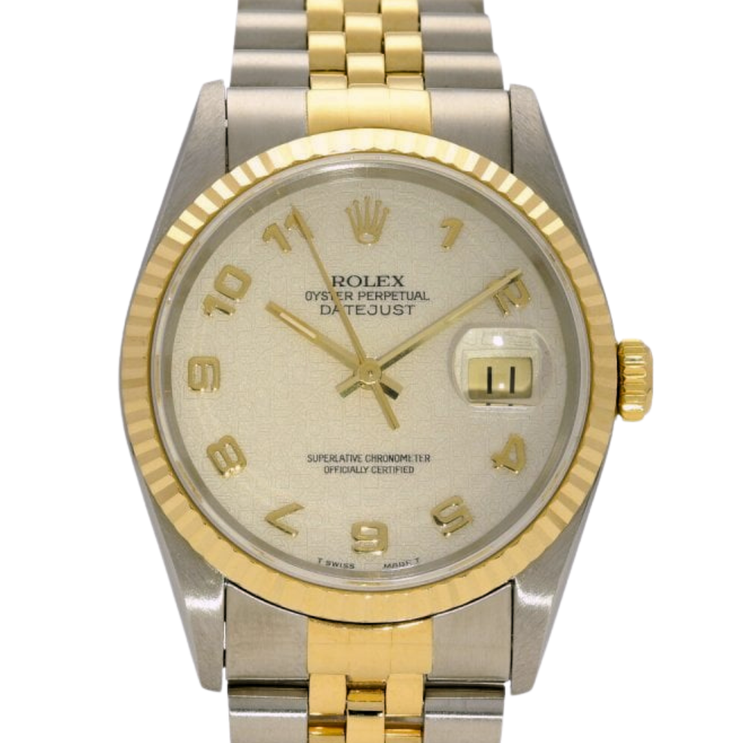 This 1996 Rolex Datejust 16233 is a classic bi-metal reference that captures everything collectors love about the early five-digit era. The 36mm stainless-steel case is paired with 18ct yellow gold throughout the fluted bezel and Jubilee bracelet centre links, giving the watch that unmistakable warm two-tone presence. The standout feature here is the cream Jubilee dial – a highly sought-after pattern that adds depth, texture and vintage charm. The applied Arabic numerals in yellow gold enhance legibility while maintaining a refined, understated look that sets this dial configuration apart from more common variants.