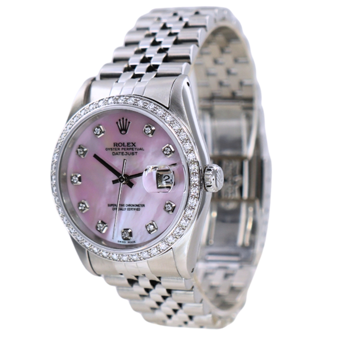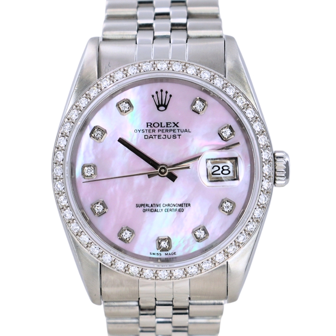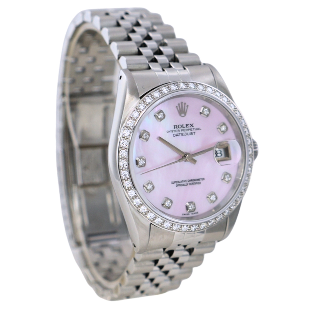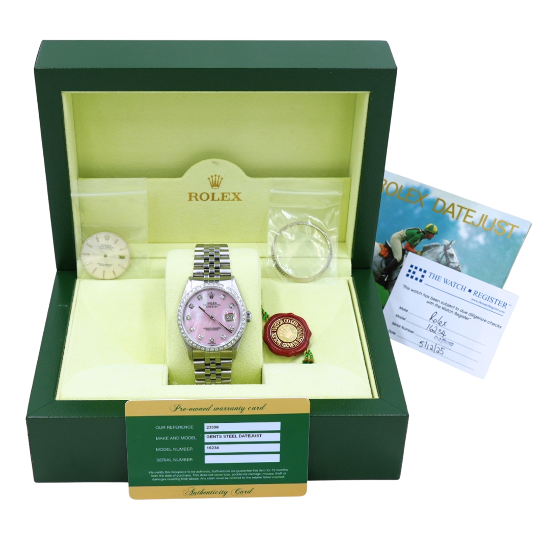 A Rolex Datejust 36 Watch, model 16234, presented in immaculate condition. This 1991 stainless steel reference features an afterset diamond bezel and an afterset pink mother-of-pearl dial with diamond hour markers, fitted to the Jubilee bracelet. The Rolex Calibre 3135 automatic movement powers the 36mm Oyster case. Notably, the watch is accompanied by its original Rolex bezel and dial. Supplied in a box and certified, it includes authenticity paperwork, a Watch Register certificate, and a 12-month WLC warranty.