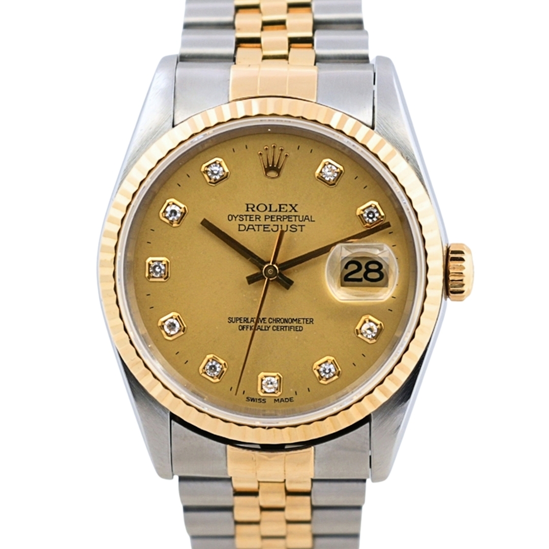 A Bi-Metal Rolex Datejust Watch, Stainless Steel and 18ct Yellow Gold with a Yellow Gold Fluted Bezel and a Champagne Dial with Original Rolex Diamond Numerals