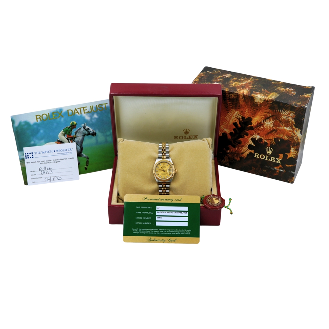 A Bi-Metal Rolex Datejust 26, reference 69173, embodies timeless elegance and refined craftsmanship. Crafted from stainless steel and 18ct yellow gold, this classic model features the signature fluted yellow gold bezel paired beautifully with a stunning champagne dial. The dial is enhanced with diamond-set hour markers that shimmer with understated luxury, creating a captivating contrast against the warm tones of gold and steel. The 26mm Oyster case and Jubilee bracelet complete the design, offering a perfect blend of comfort and sophistication.
