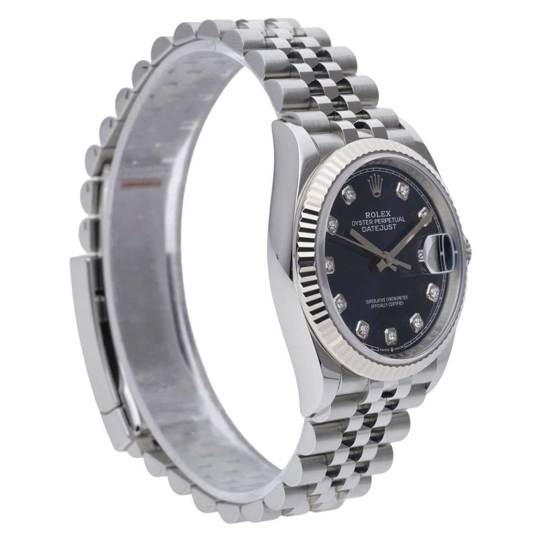 This bi-metal Rolex Datejust reference 126234 presents the classic 36mm Oyster case in stainless steel, paired with an 18ct white gold fluted bezel and Jubilee bracelet. The rich blue dial is fitted with original Rolex diamond numerals, offering a refined contrast against the polished white gold surrounds and applied coronet. A sapphire crystal with cyclops date magnification completes the familiar Datejust aesthetic.