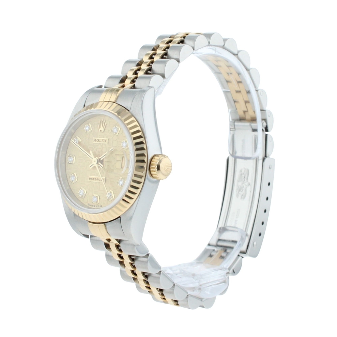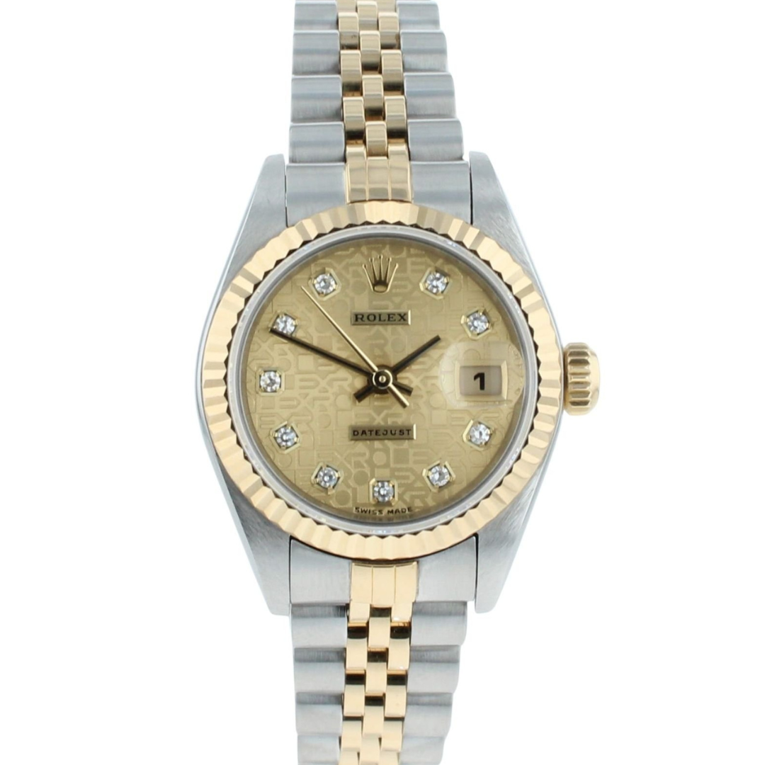 A Bi-Metal Rolex Datejust 26 that perfectly captures the timeless elegance of the classic Lady-Datejust, this reference 69173 pairs stainless steel with 18ct yellow gold to create an unmistakably luxurious presence on the wrist. The watch features the highly sought-after Champagne Jubilee Diamond Dial, distinguished by its repeating ROLEX motif across the dial and original factory diamond hour markers that add a refined sparkle from every angle. Complementing the dial is the 18ct yellow gold fluted bezel, adding depth, character, and that signature Datejust brilliance.