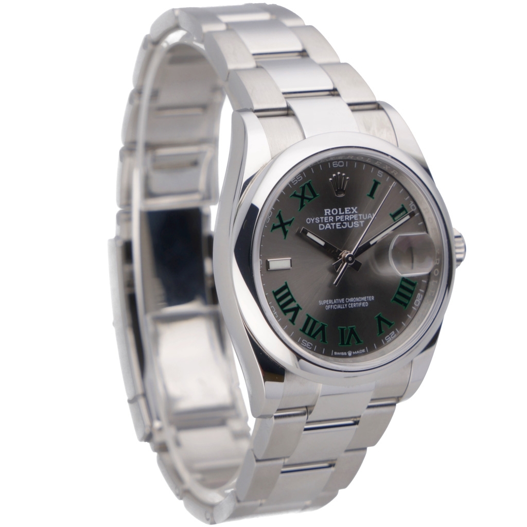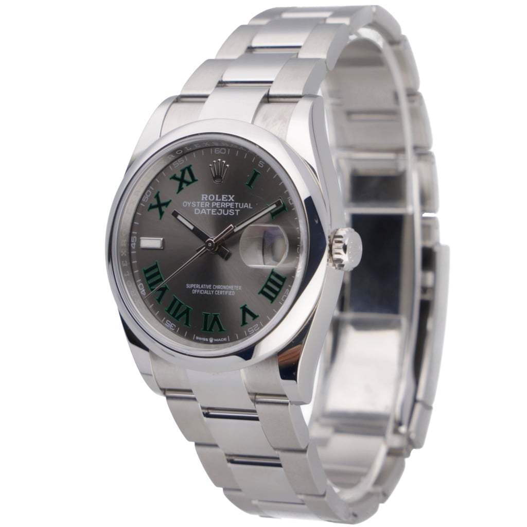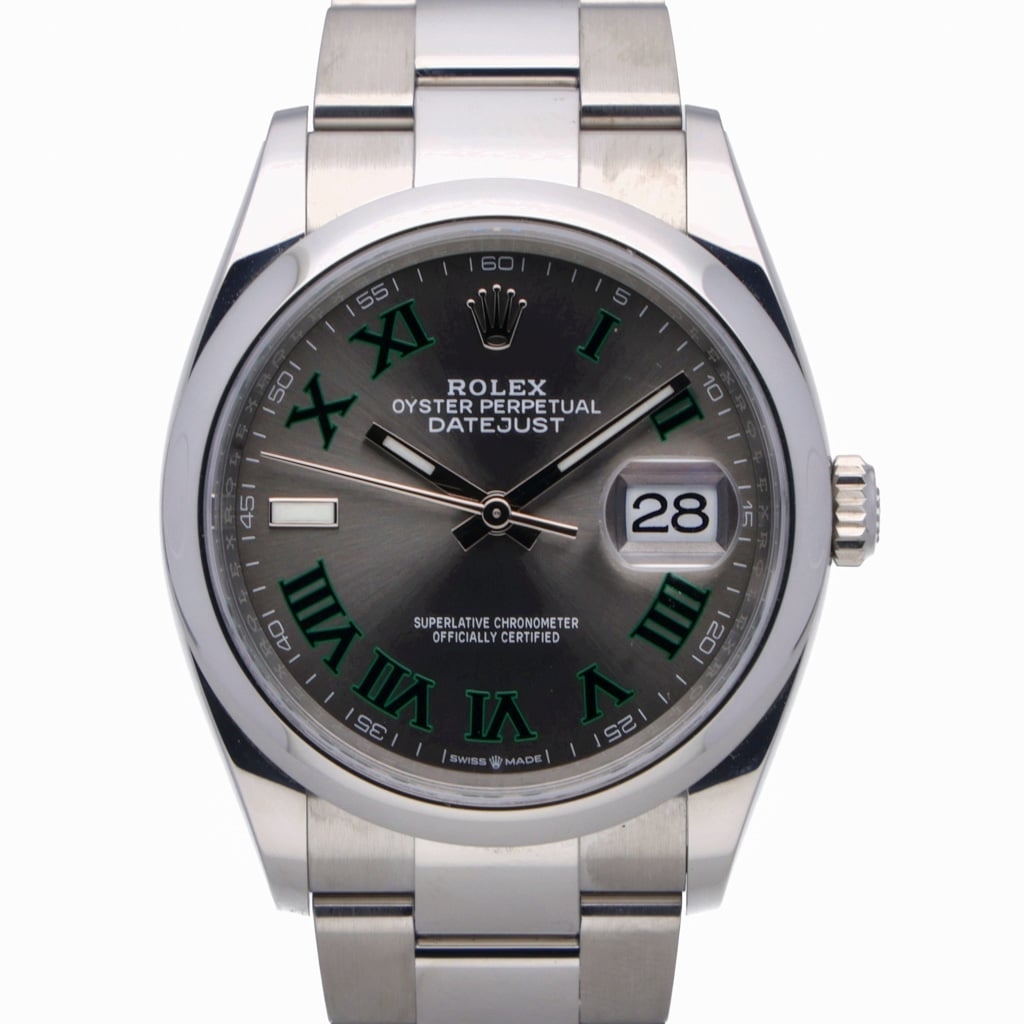 A Rolex Datejust 126200, a sleek and modern iteration of the classic Datejust design, is a stunning timepiece that combines precision, style, and versatility. This 2024 model is crafted from stainless steel, offering robustness and a refined aesthetic. The 36mm case provides a more significant wrist presence while maintaining a timeless, elegant profile. The slate dial is striking, offering a dark, sophisticated hue that contrasts beautifully with the polished silver hour markers and hands. This contemporary colour choice gives the watch a unique, understated look that is versatile for any occasion.