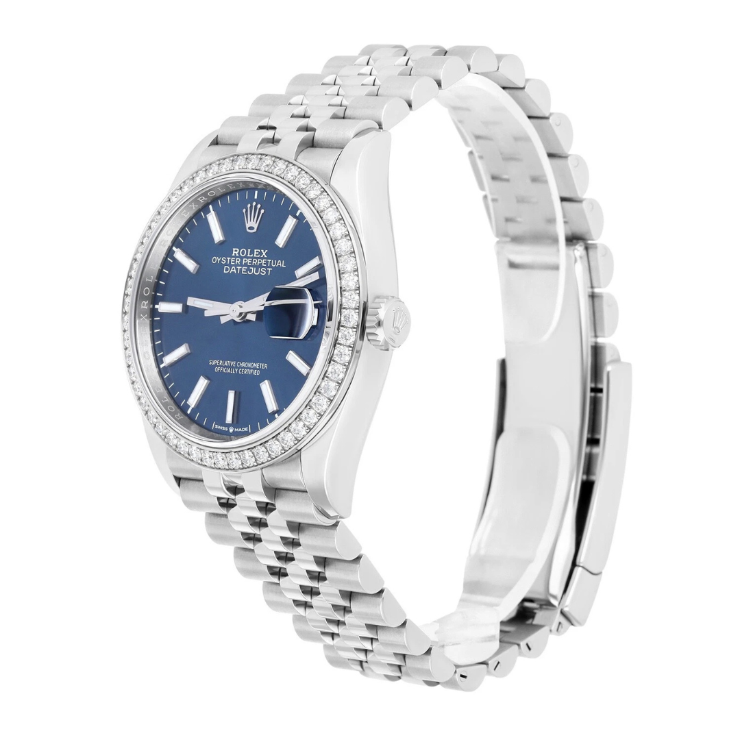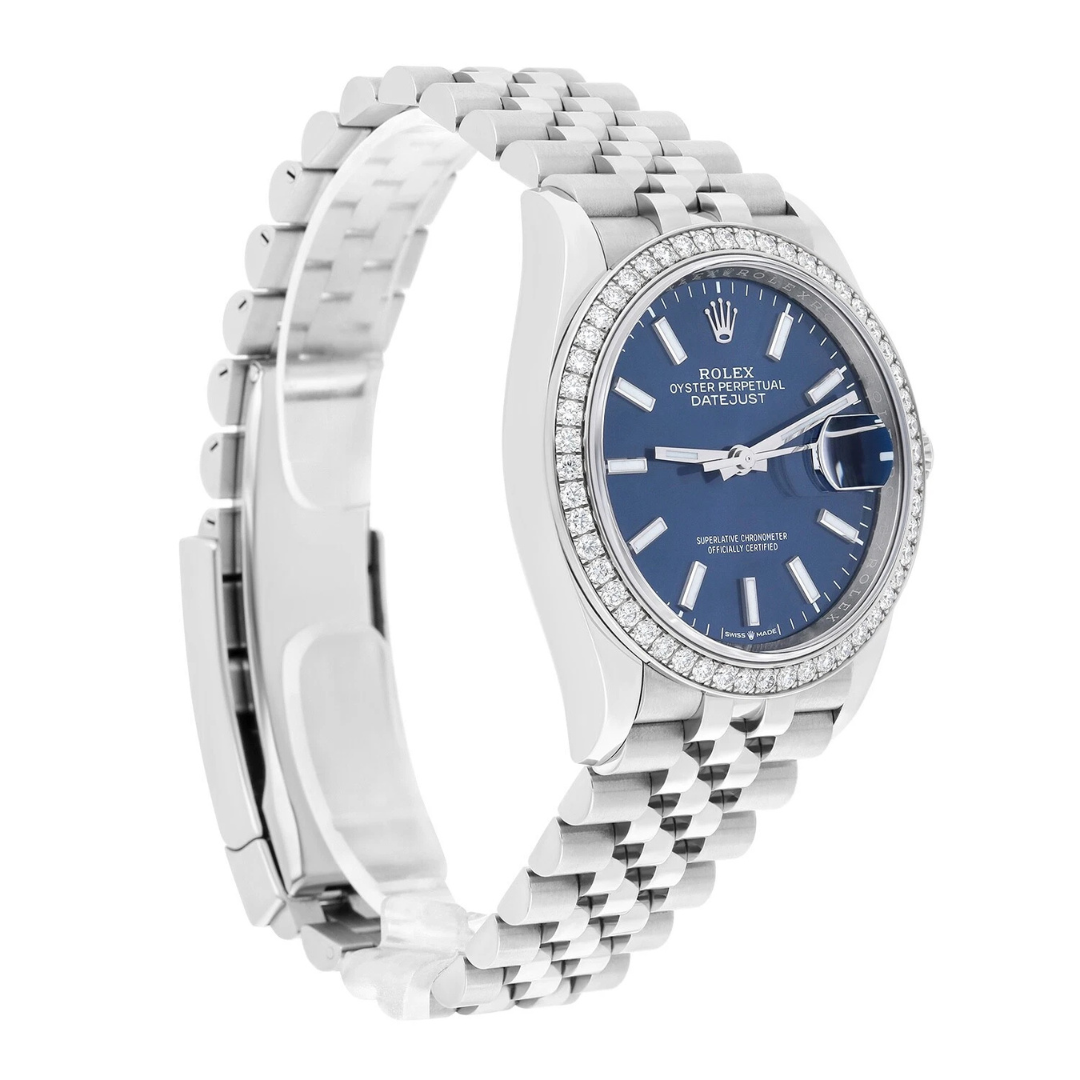 A Rolex Datejust Watch, model 126284RBR, presented in immaculate condition. This 2020 reference is crafted in stainless steel and paired with an 18ct white gold factory diamond-set bezel, framing a rich blue dial with applied baton hour markers. The 36mm Oyster case offers classic proportions and everyday versatility.