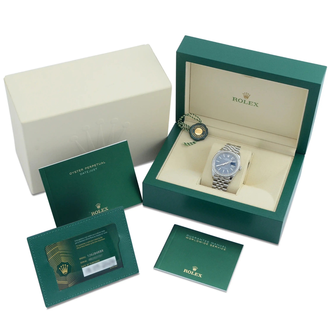 Diamond-bezel Datejust models with blue dials remain consistently sought after, combining timeless design with elevated luxury. Offered with its original full set of paperwork, presentation box, and a 12-month WLC warranty, this 126284RBR represents a well-balanced opportunity within the modern Rolex market.