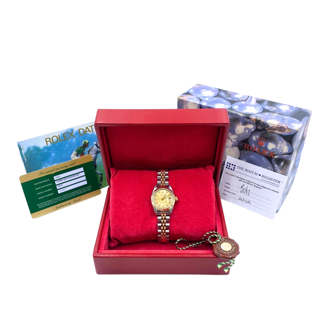 A Bi-Metal Rolex Datejust 26, reference 69173, embodies timeless elegance and refined craftsmanship. Crafted from stainless steel and 18ct yellow gold, this classic model features the signature fluted yellow gold bezel paired beautifully with a stunning champagne dial. The dial features diamond-set hour markers that shimmer with understated luxury, creating a captivating contrast against the warm tones of gold and steel. The 26mm Oyster case and Jubilee bracelet complete the design, offering a perfect blend of comfort and sophistication.