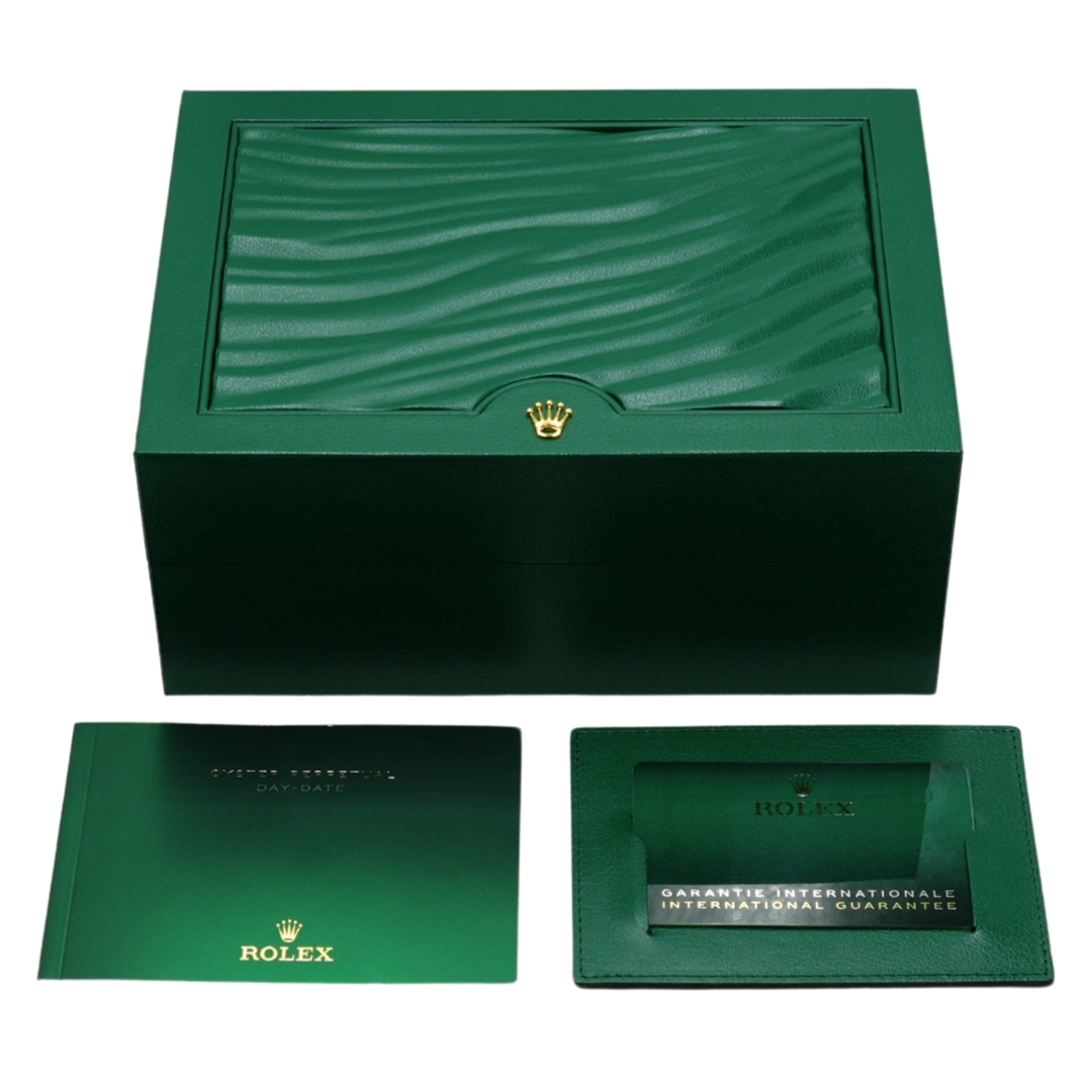 This immaculate example is complete with its original Rolex presentation box, paperwork, and certification. It also comes with a 12-month WLC Warranty, providing added peace of mind. Boxed and Certified, this Day-Date 40 is not only an enduring symbol of success and prestige but also a beautiful investment piece, sought after for its rarity, prestige, and timeless aesthetic.