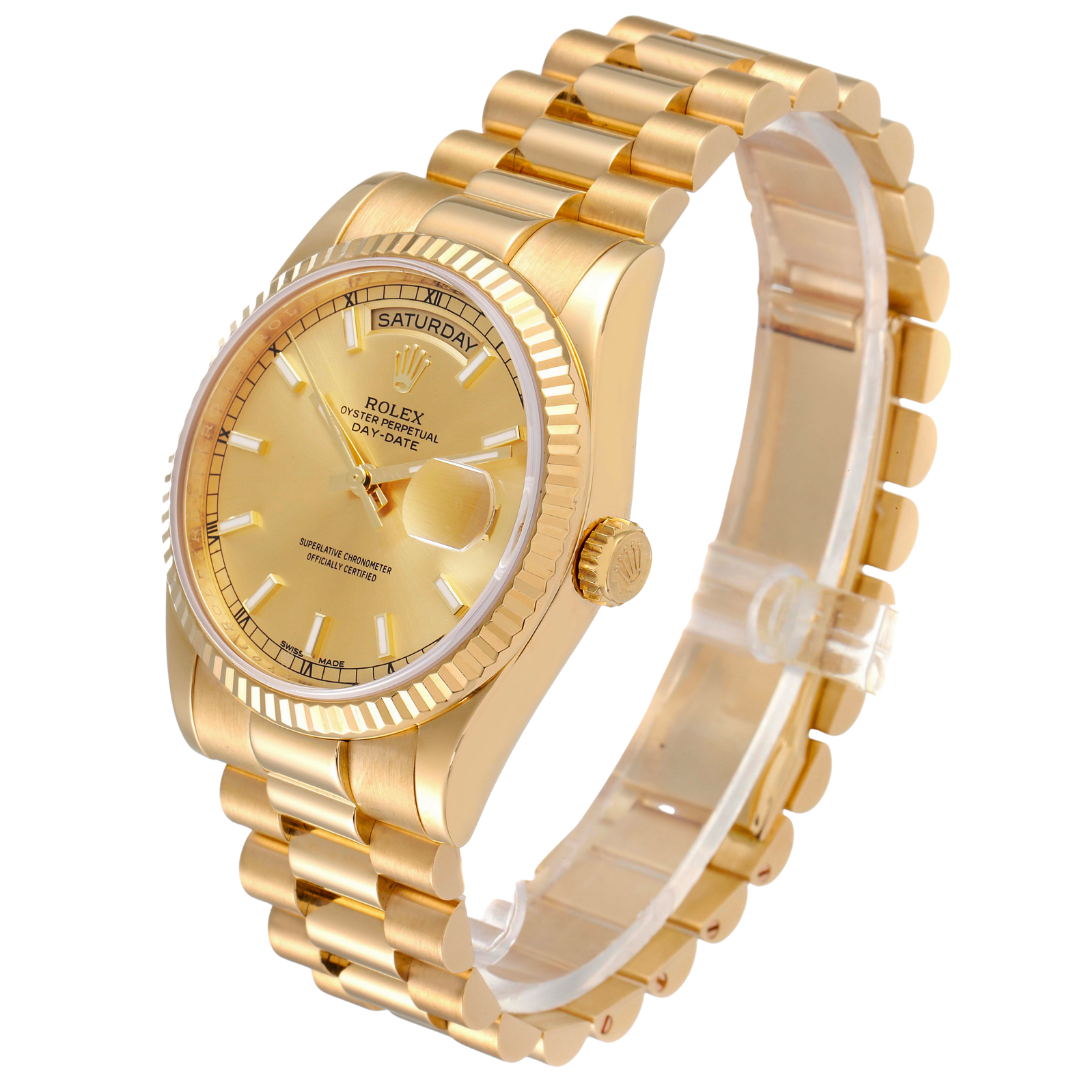 A Rolex Day-Date 118238 in full 18ct yellow gold, fitted with the iconic President bracelet and a matching fluted bezel. This 36mm example features a classic gold dial with applied baton hour markers, paired with the signature day display at 12 o’clock and date aperture at 3, delivering the unmistakable Day-Date identity that has long symbolised status and refinement.