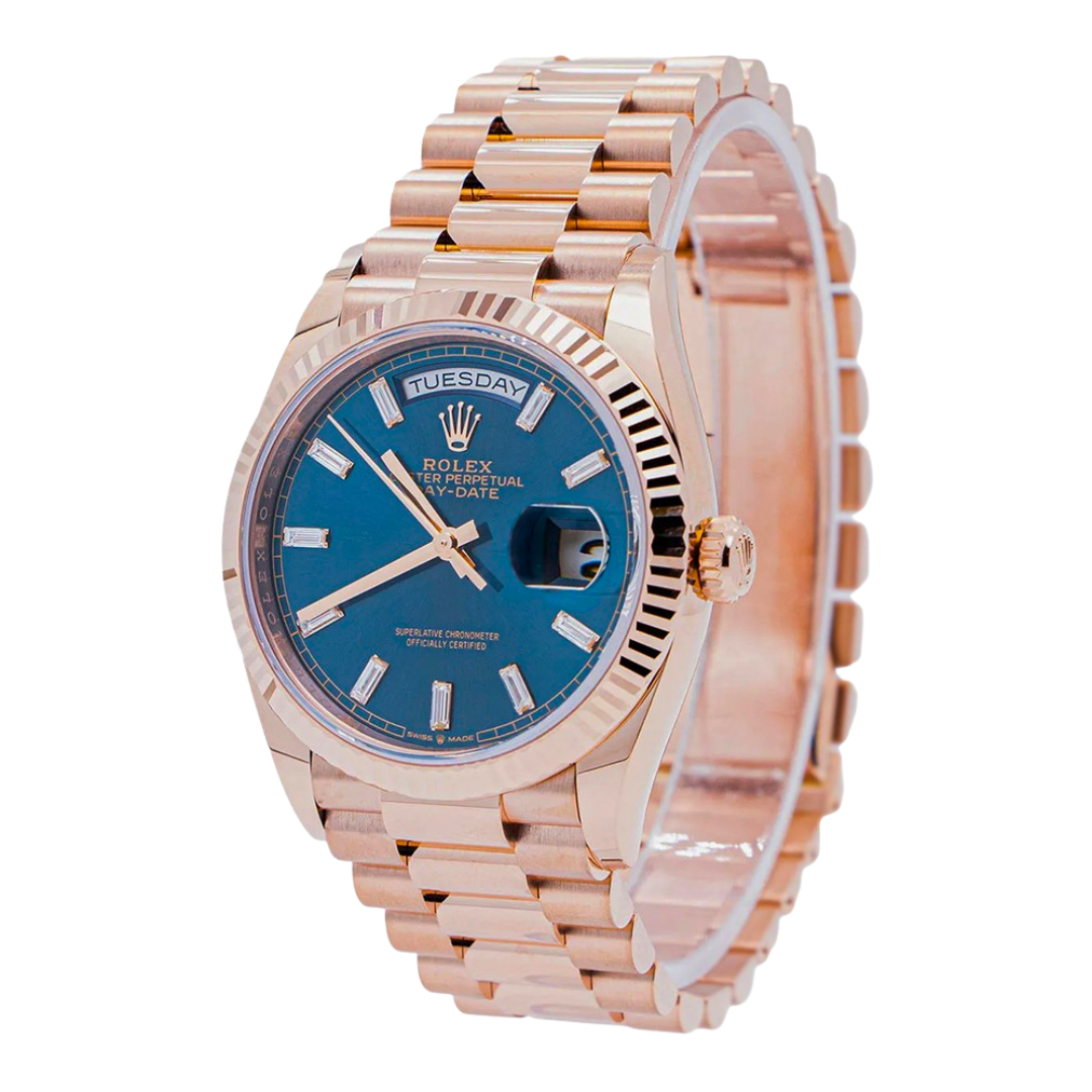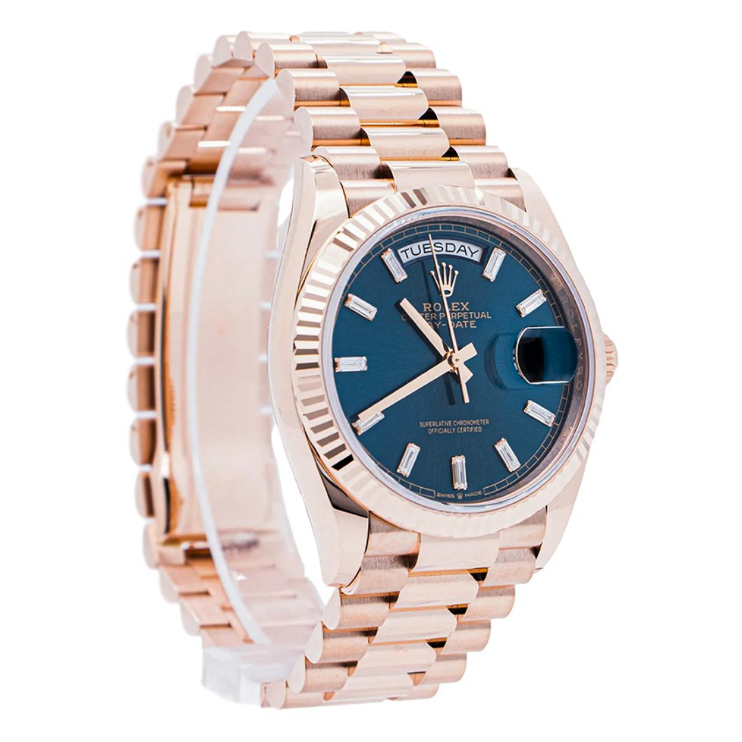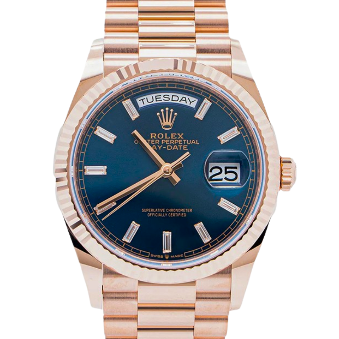 A Rolex Day-Date reference 128235, crafted entirely from solid 18ct Everose gold and fitted with the iconic President bracelet. The 36mm case is paired with a fluted Everose gold bezel and a striking blue ombré dial, subtly transitioning from deep blue at the edge to a lighter centre, accented by original Rolex baguette diamond hour markers and the signature day and date apertures.