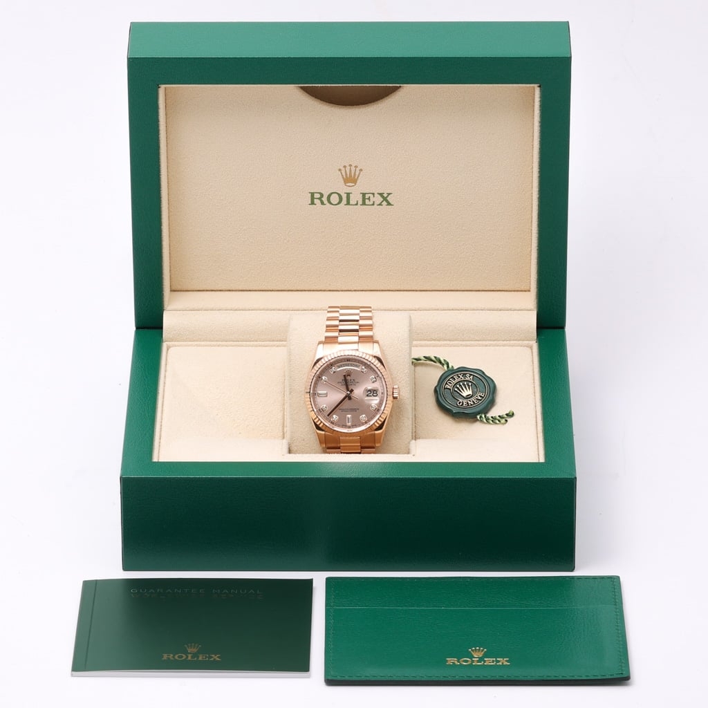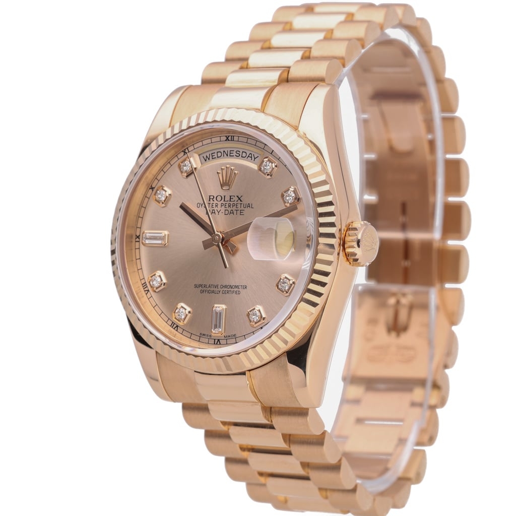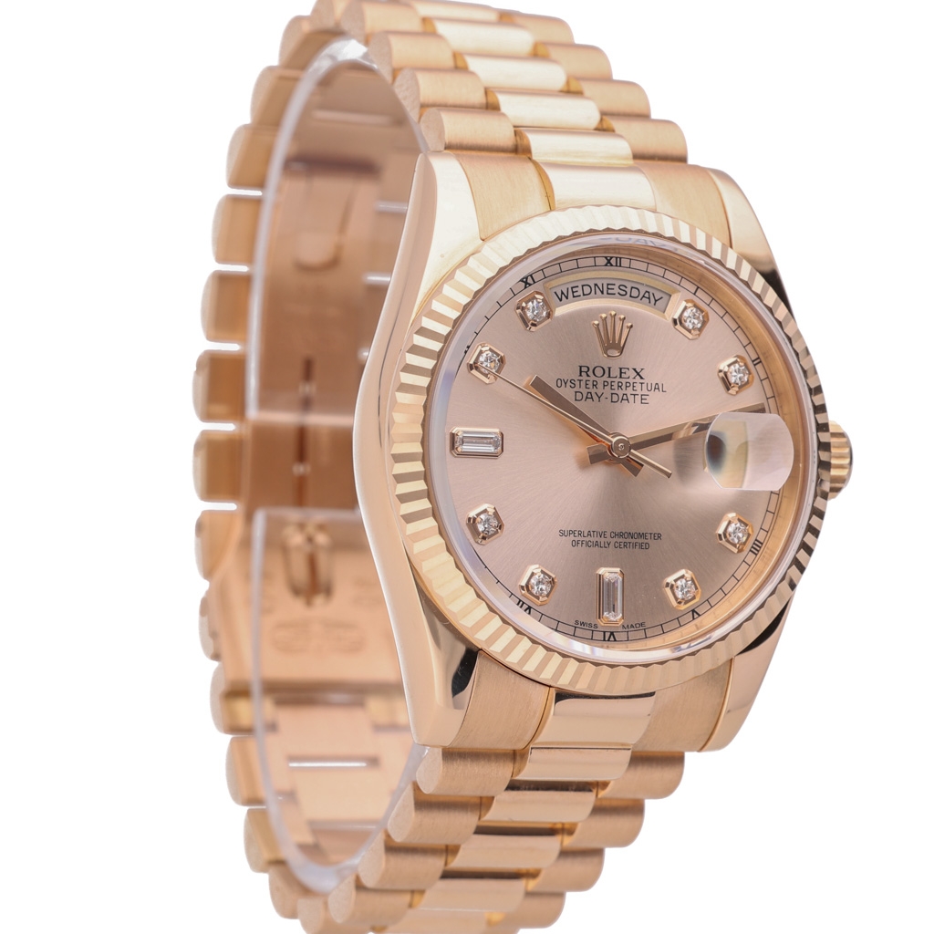 The classic 36mm Oyster case is complemented by the signature fluted bezel, a hallmark of the Day-Date that reflects light beautifully while enhancing the watch’s unmistakable presence. The warm pink dial is elevated by original Rolex diamond hour markers, including baguette-set diamonds at six and nine o’clock, adding an additional level of refinement and exclusivity. Powering the watch is the Rolex Calibre 3155 automatic movement, renowned for its reliability and precision.