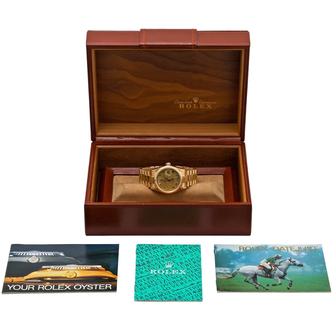 Powered by the Rolex Calibre 3055 automatic movement, this reference offers reliable precision and a quickset date function for practical daily use. The solid 18ct yellow gold President bracelet is presented with the sought-after bark finish, adding texture and vintage character that sets it apart from standard configurations.