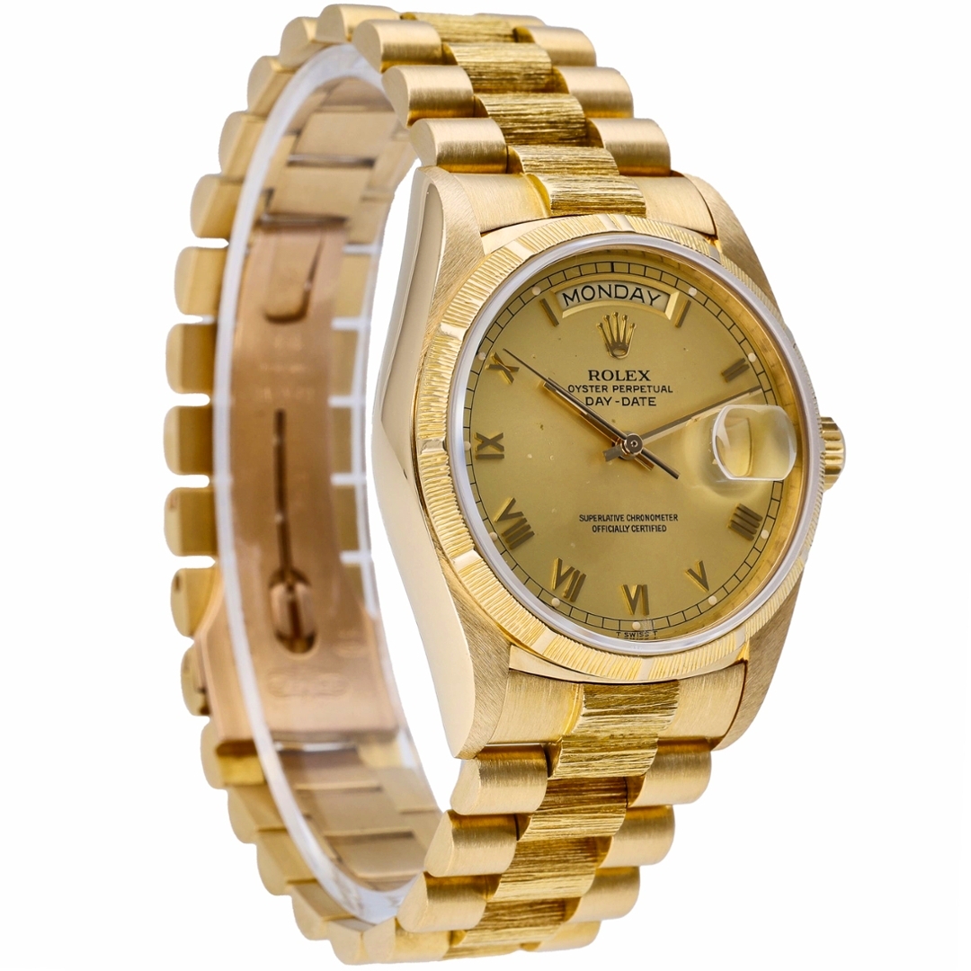 A Rolex Day-Date Watch, Full 18ct Yellow Gold with an Engine-Turned Bezel and a Champagne Dial on a President Bracelet with a Bark finish