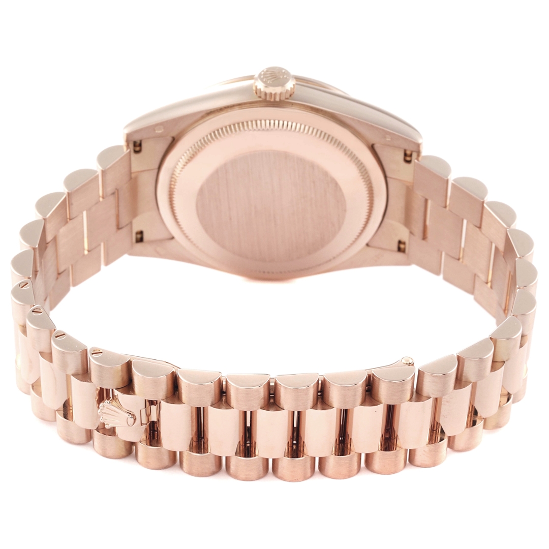 A Rolex Day-Date reference 118235F in full 18ct Everose gold, fitted with a factory diamond dial and presented on the iconic Presidential bracelet. The 36mm case is complemented by a fluted bezel in matching Everose gold, delivering the unmistakable presence that has defined the Day-Date line for decades. The sunburst dial is enhanced by diamond hour markers, including a baguette-cut diamond at 6 o’clock, adding refinement without overpowering the classic design.
