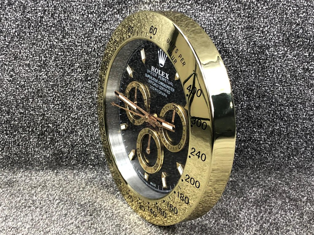 A stainless steel replica Rolex Daytona wall clock, presented with a striking black dial and gold-tone bezel that delivers a bold and luxurious interpretation of this iconic chronograph design. The contrasting gold accents across the hands, hour markers, and sub-dial surrounds create a rich, eye-catching aesthetic, while the tachymeter scale enhances its unmistakable motorsport-inspired identity.