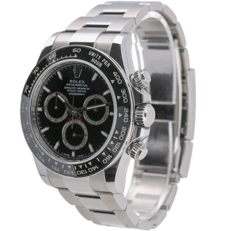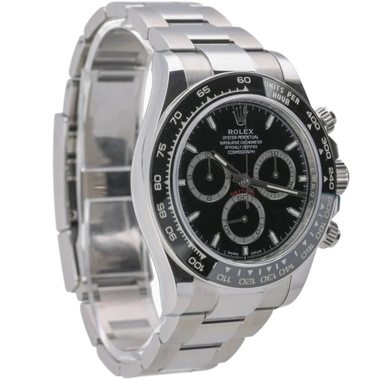 A Rolex Daytona Watch, Stainless Steel with a Black Bezel and Dial.