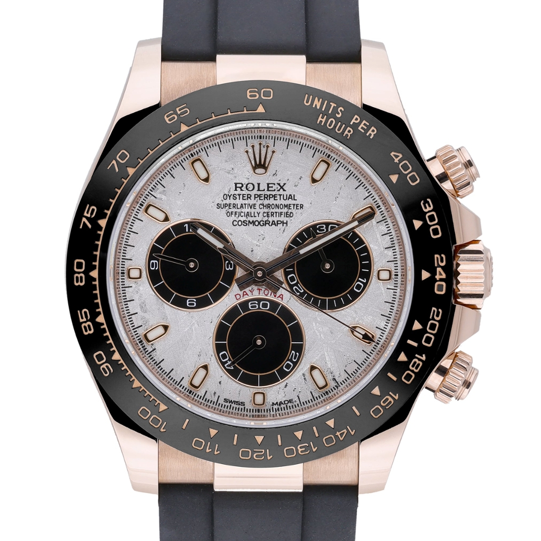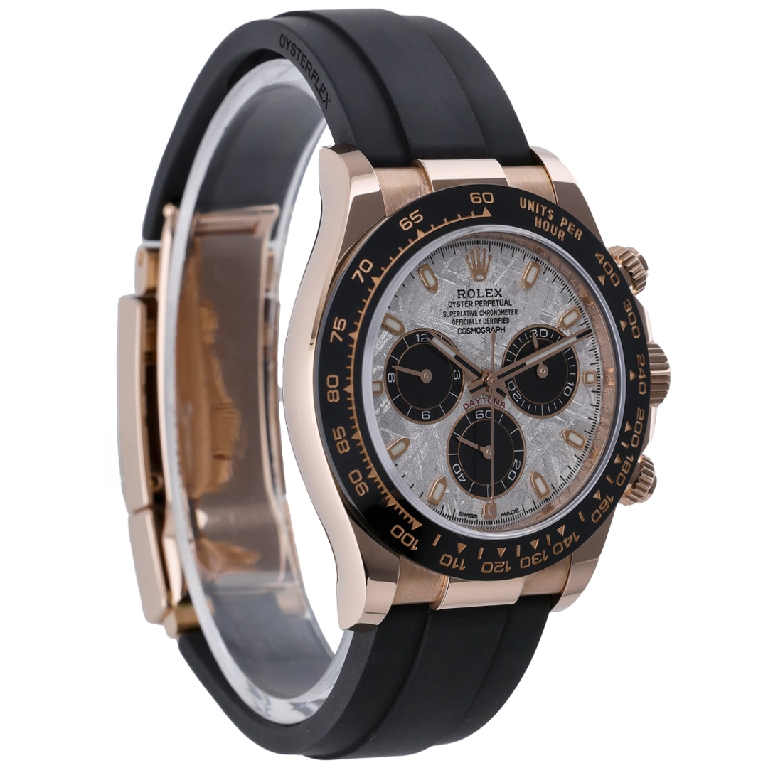 A Rolex Daytona Watch, model 116515LN, featuring a 40mm 18ct Everose gold case paired with a black Cerachrom bezel and fitted to a black Oysterflex rubber strap with matching Everose gold clasp. This configuration is elevated by the exceptional meteorite dial, showcasing its unique natural crystalline pattern, complemented by contrasting black chronograph sub-dials and rose gold hour markers. The combination of precious metal, ceramic and Oysterflex delivers a contemporary yet unmistakably luxurious interpretation of the iconic Daytona.