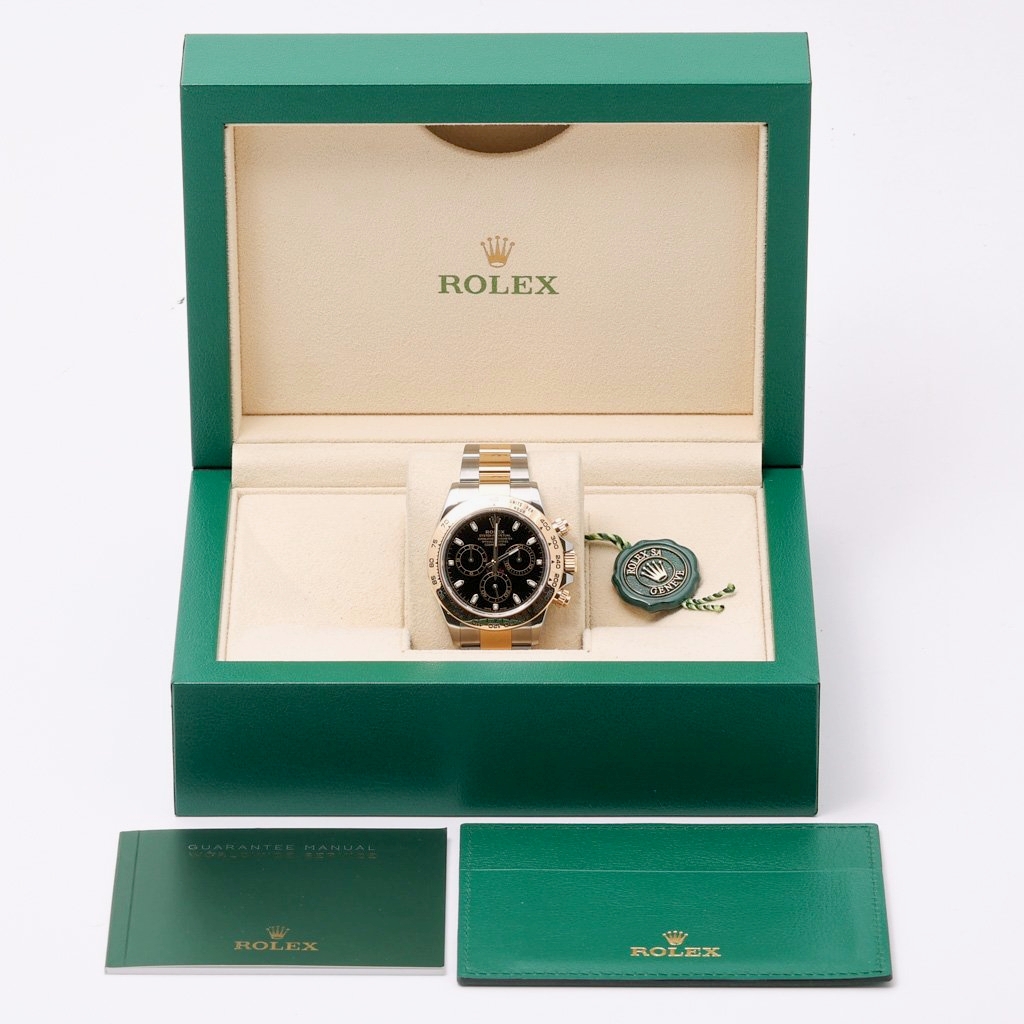 A bi-metal Rolex Daytona 116503, combining stainless steel with 18ct yellow gold and finished with a sleek black dial, embodies the perfect fusion of sport and sophistication. This 2020 model features a 40mm Oyster case, robust screw-down pushers, and a solid-link Oyster bracelet, maintaining the Daytona’s legendary racing heritage while adding an unmistakable touch of luxury.