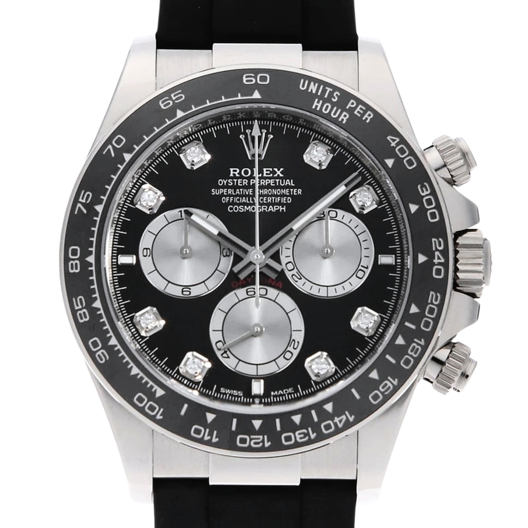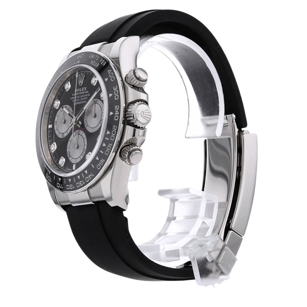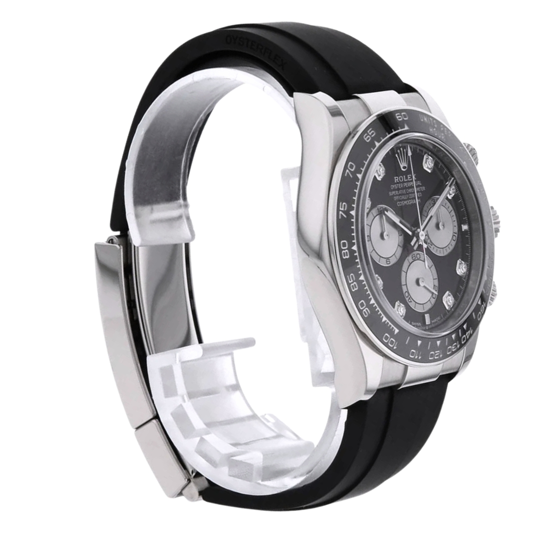 A Rolex Daytona Watch, Black Rubber Strap with an 18ct White Gold Case and Clasp and a Black Bezel on a Grey Dial with Original Rolex Diamond Numerals.