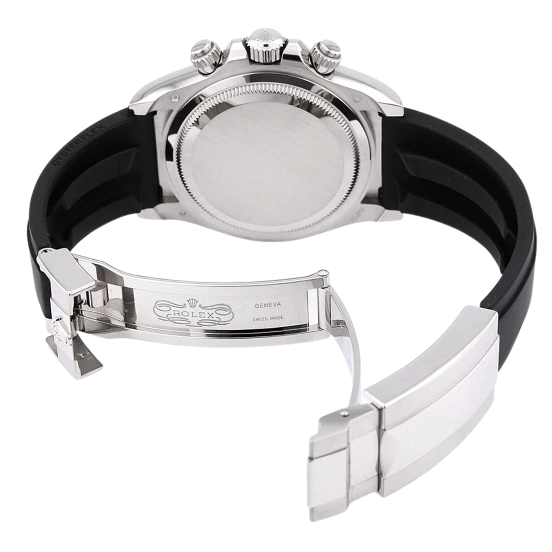 Encased in 18ct white gold, this Daytona exudes sophistication and refinement, accentuated by a sleek black rubber strap for a contemporary twist on traditional luxury. The black bezel and grey dial complement each other perfectly, creating a striking contrast that draws attention at first glance.