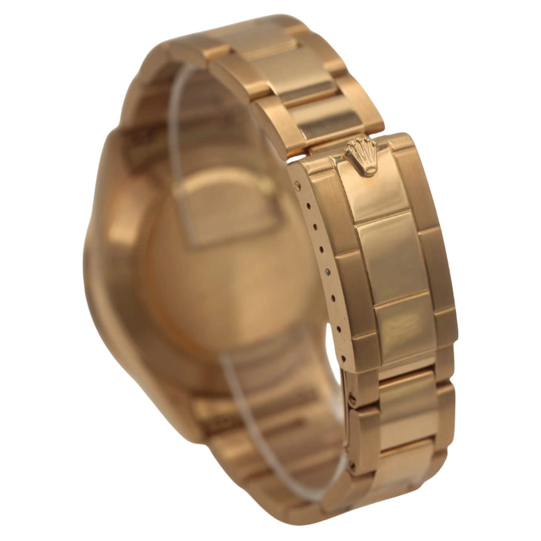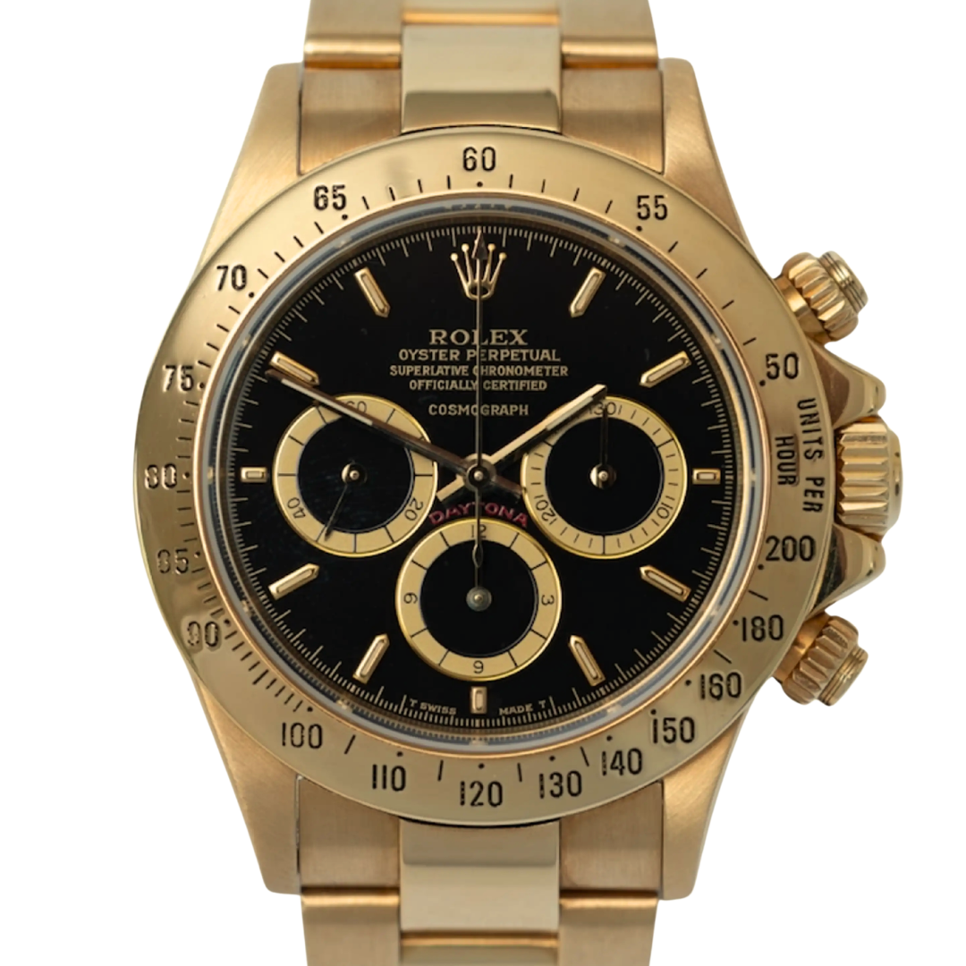A Rolex Cosmograph Daytona reference 16528 in full 18ct yellow gold, featuring a 40mm Oyster case and a matching gold tachymeter bezel, delivering unmistakable presence on the wrist. The black dial is sharply contrasted with champagne sub-dials, creating the highly sought-after “Paul Newman-inspired” aesthetic, with applied hour markers and chronograph registers that offer both clarity and depth.