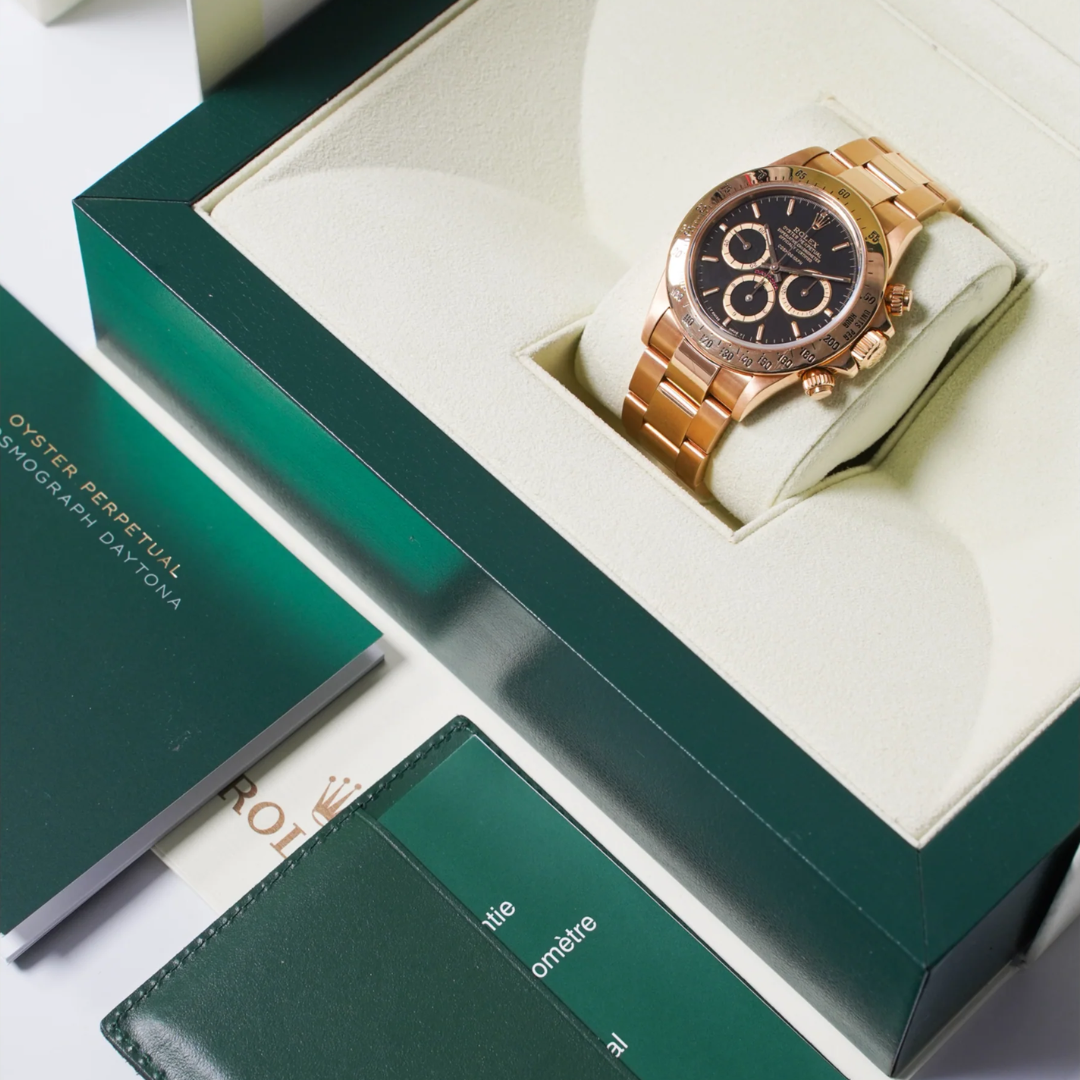 Powered by the Rolex Calibre 4030 automatic movement, based on the renowned Zenith El Primero, this reference is celebrated for its reliability and significance within the Daytona lineage. The chronograph function operates with precision, while the overall construction reflects Rolex’s robust engineering and enduring design philosophy.