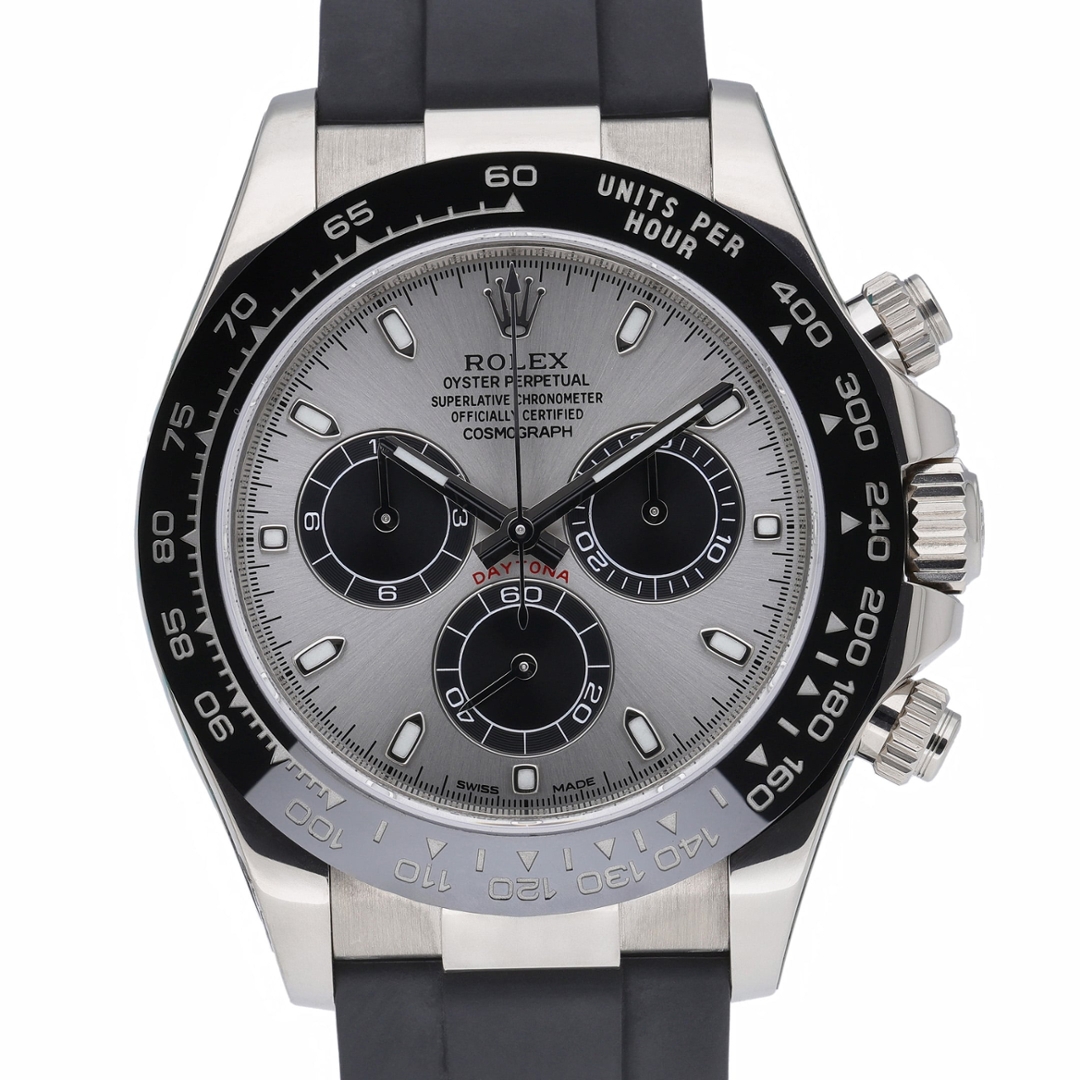 A Rolex Daytona 116519LN presents a refined combination of 18ct white gold, a black Cerachrom bezel and a steel-toned dial with bright black chronograph counters. The 40mm case offers a contemporary yet elegant profile, complemented by the Oysterflex strap, which blends the comfort of rubber with the stability of a metal core. The contrasting sub-dials and luminous hour markers provide excellent readability across varied environments.