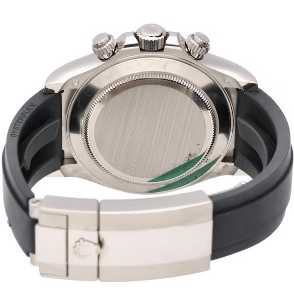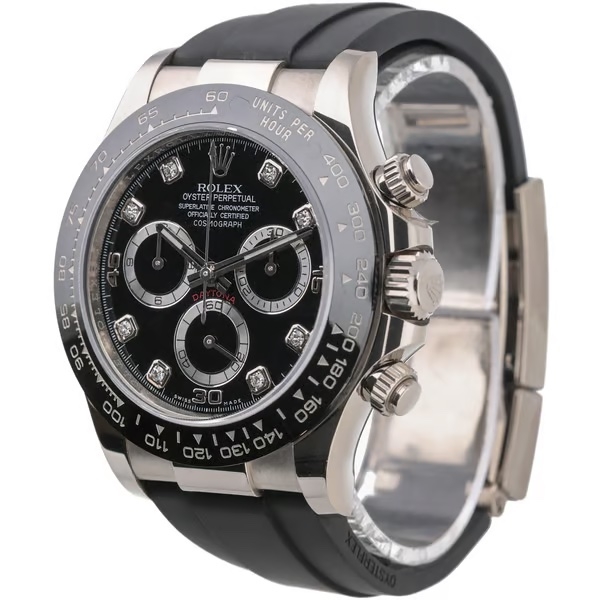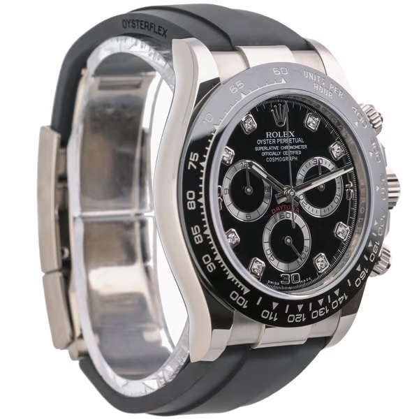 A Rolex Cosmograph Daytona reference 116519LN in 18ct white gold, presented on a black Oysterflex strap with a matching white gold clasp, combining precious metal construction with a modern, sport-driven aesthetic. The black dial is set with original Rolex diamond hour markers and features contrasting silver-ring sub-dials, offering excellent legibility while maintaining a refined and balanced chronograph layout, framed by a black Cerachrom tachymeter bezel.