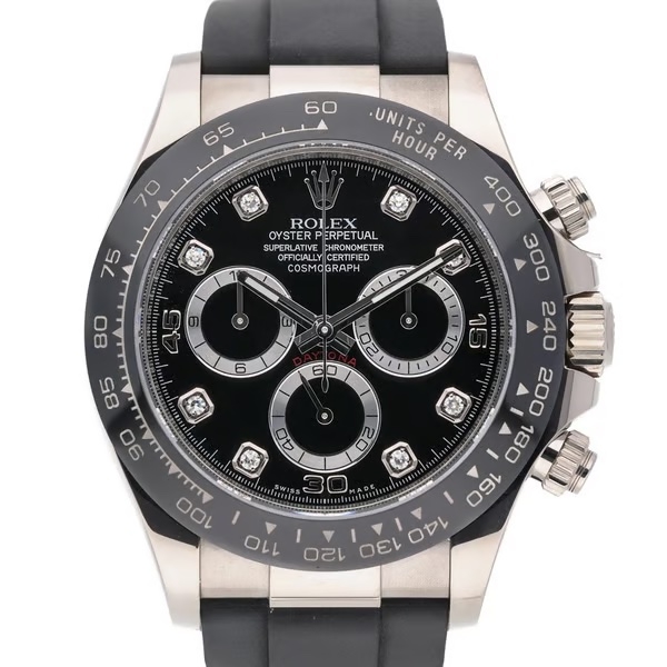 A Rolex Daytona Watch, Black Rubber Strap with an 18ct White Gold Case & Clasp and a Black Bezel & Dial with Original Diamond Numerals.