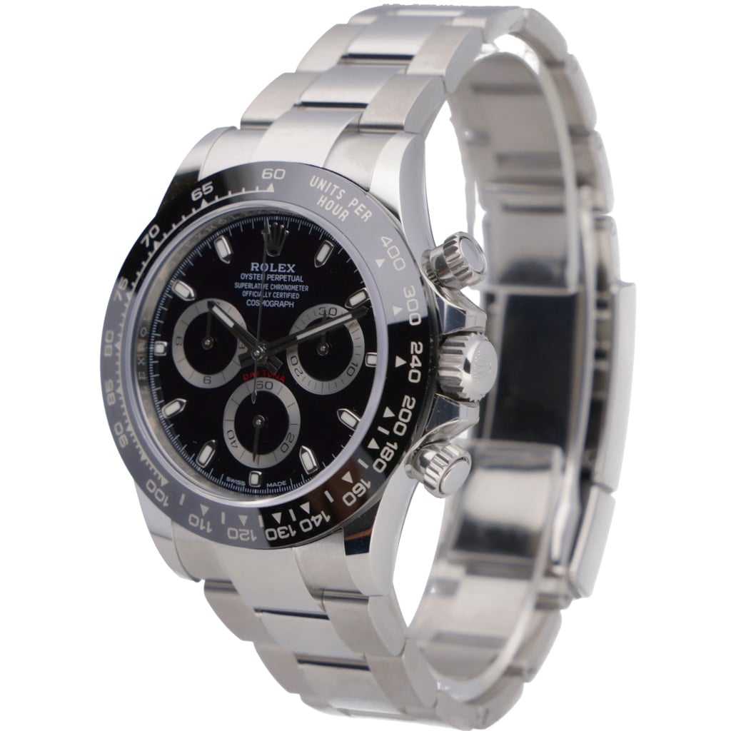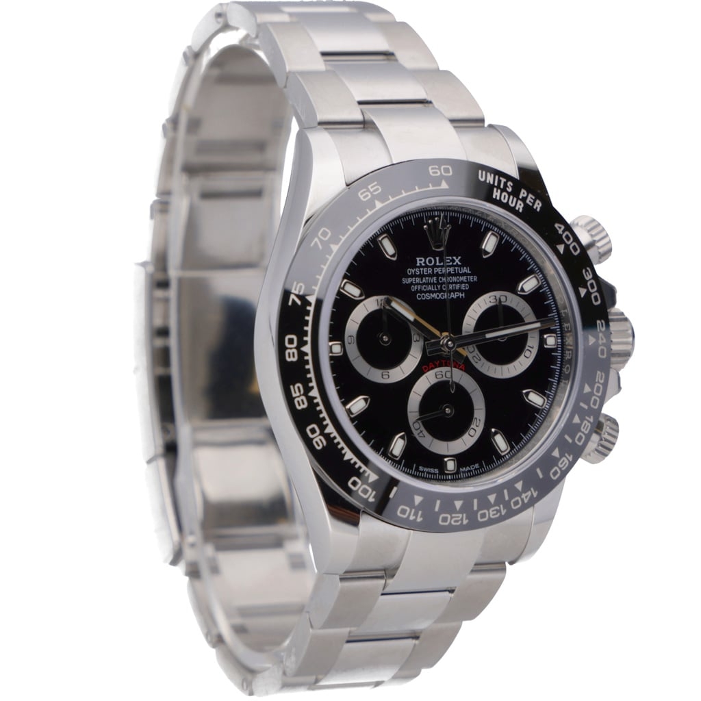 A Rolex Daytona is one of the most sought-after modern chronographs, presented in stainless steel with a black Cerachrom bezel and matching black dial. The 40mm Oyster case offers perfectly balanced proportions, combining sporty presence with refined finishing. The dial layout is clean and instantly recognisable, featuring contrasting chronograph sub-dials, luminous hour markers, and polished hands, while the engraved tachymeter bezel reinforces the Daytona’s motorsport heritage.